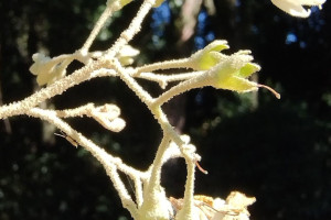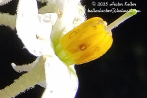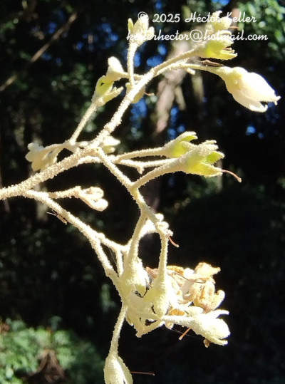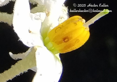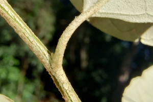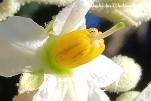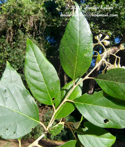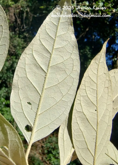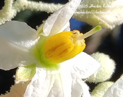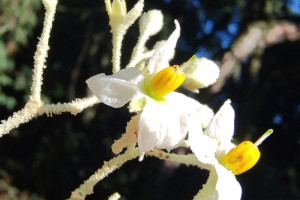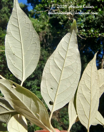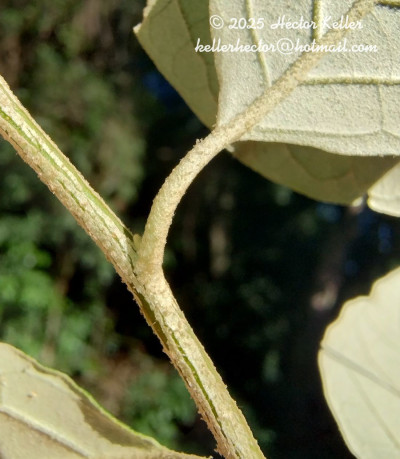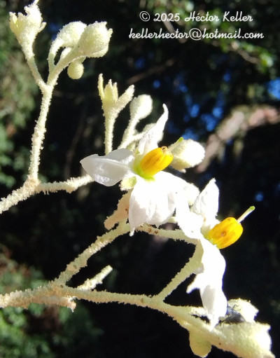 Árboles o arbolitos de 2-10 m de alto; tallos con abundantes tricomas estrellados sésiles y estipitados. Hojas solitarias, a veces desigualmente geminadas en las ramas más apicales; pecíolos de 10-30 mm; láminas ovadas a angostamente ovadas, de 6-12 × 3-5 cm, de base cuneada, ápice largamente acuminado, discoloras; epifilo verde pardo a verde oscuro, glabrescente; hipofilo verde grisáceo a verde blanquecino, con nervaduras principales prominentes, abundantes tricomas estrellados y ramificados; hojas axilares ausentes. Inflorescencia terminal u opuesta a la hoja, ramificada varias veces, pluriflora, con más de 20 flores; pedúnculos de 1,6-5 cm. Pedicelos de 6-12 mm; cáliz de 4,5-6 mm, partido 1/2 a 3/4 su longitud, pubescente en su superficie exterior, glabro en el interior, lóbulos triangulares, de 2,5-3 mm; corola estrellada, de 15-17 mm de diámetro, ca. 12 mm de largo, excediendo la longitud del cáliz, blanca; filamentos de 1,5 mm, anteras ca. 3,5 mm; ovario glabro, estilo de 7 mm, superando la longitud del androceo. Baya hasta de 10 mm, morada, negra, tintórea, glabra; semillas castaño claras, de 3 × 2,5 mm.