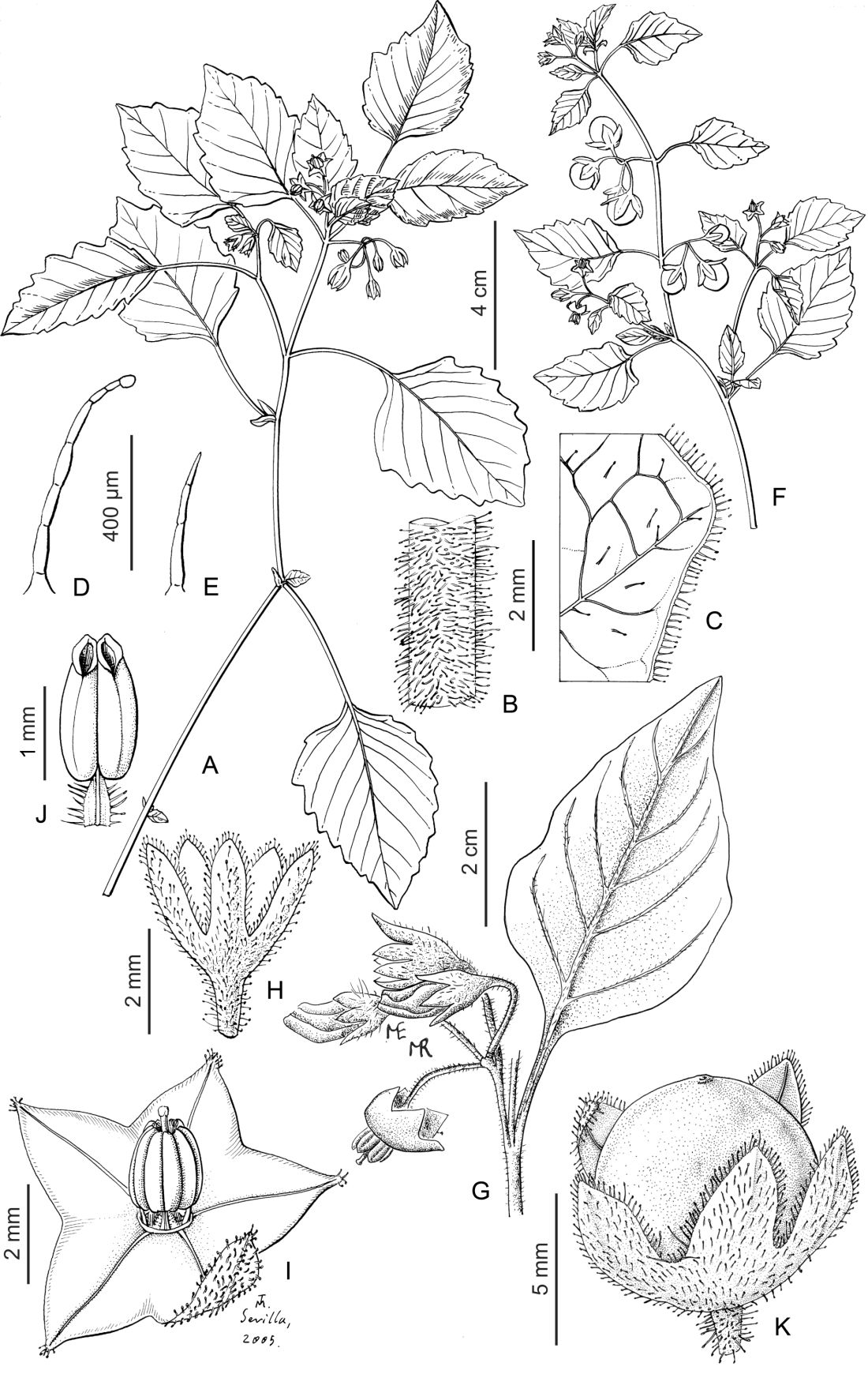 Hierbas anuales, por lo general erectas, ca. 70 cm de alto, densamente víscido-pubescentes, ramificadas; tallos apenas aristados, con tricomas glandulares densos (pie pluricelular; cabezuela oblonga 1-celular), de 1-2 mm, flexuosos, entremezclados con otros más cortos. Unidades simpodiales 1-foliadas. Hojas brevipecioladas; pecíolos de 1,3-2 cm; láminas ovadas a elípticas, de 4-5(-8) × 1,5-2,7 cm, base atenuada, ápice agudo, margen dentado, con 5-6 pequeños dientes, regularmente distribuidos a lo largo de la lámina, epifilo e hipofilo con pubescencia densa de tricomas glandulares y otros pocos tricomas eglandulares semejantes a los del tallo. Inflorescencia subopuesta a las hojas o extra-axilar, simple, umbeliforme a subumbeliforme, con 2-5(-6) flores, densamente pubescente, con tricomas similares a los presentes en tallos y hojas; pedúnculos de 8-9 mm. Botones florales anchamente elipsoides, glandulosopubescentes; cicatrices de los pedicelos espaciadas entre 0-0,3 mm; pedicelos de 2-5 mm; cáliz campanulado, de 3-6 mm, con pubescencia glandular densa, lóbulos triangulares, de 2,5-5 × (0,8-)1-1,5 mm, agudos; corola semiestrellada, de 4-6,5 mm, blanca y con el centro amarillo-parduzco, lóbulos triangulares, casi tan largos como anchos, de 3-4 × 3-3,5 mm, con abundantes tricomas glandulares, largos, por fuera; filamentos adheridos a 0,8-1,2 mm de la base de la corola, sector libre de 1,1-1,5 mm, pubescente, anteras elipsoides, ca. (1,1-)1,5-2,1 × 0,5-0,8 mm, gineceo de 3-3,7 mm; ovario ovoide, glabro; estilo de 5,3-5,5 mm, de igual longitud que el androceo o apenas más largo, pubescente un poco más allá de su mitad basal, estigma capitado. Baya globosa, de 6-9 mm de diámetro, uniformemente verde pálida, opaca cuando madura; pericarpo con 4 a 6 esclerosomas distribuidos en toda la baya, de 0,5-0,7 mm de diámetro; pedicelos fructíferos deflexos, ca. 1,3 mm, ensanchados en la zona de inserción de la baya; cáliz fructífero acrescente, algo papiráceo y seco en plena madurez de la baya, lóbulos angostamente triangulares, de 5-8 × 3,5-4 mm, envolviendo casi completamente a la baya; semillas 20-50 por fruto, subglobosas a reniformes, ca. 1,5-2 × 1-1,5 mm, tegumento foveolado.