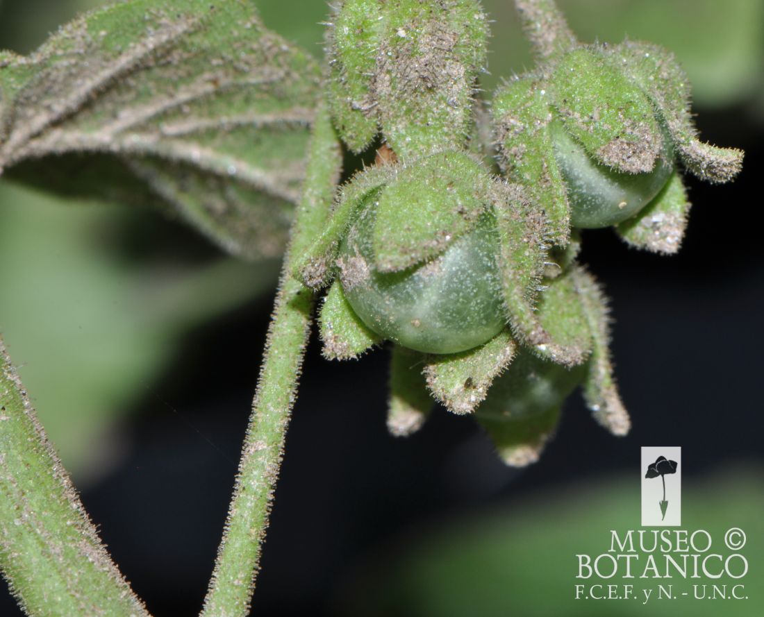 Hierbas perennes, decumbentes, de 0,30-1,5 m de alto, densamente víscido-pubescentes, muy pegajosas al tacto; tallos adultos y jóvenes aristados, con indumento denso de tricomas glandulares (pie pluricelular; cabezuela oblonga 1-celular), flexuosos, ca. 2,3 mm, entremezclados con otros más cortos, ca. 1,5 mm y algunos pocos tricomas eglandulares. Unidades simpodiales 1-foliadas o 2-foliadas. Hojas pecioladas; pecíolos de 1,5-3,5 cm; láminas triangulares, ovadas o anchamente ovadas, de 4-10 × 4-6,5 cm, base truncada, ápice agudo, margen dentado, con 6-9 dientes agudos, subiguales, regularmente distribuidos a ambos lados de la lámina, raro margen entero; epifilo e hipofilo con pubescencia densa de tricomas glandulares, con pocos tricomas eglandulares similares a los presentes en los tallos. Inflorescencia opuesta a las hojas, simple, subumbeliforme a alargada, con 6-8(-10) flores, densamente pubescente, con tricomas similares a la de los tallos y hojas; pedúnculos de 1,5- 2,3 cm. Botones florales ovoides, glanduloso-pubescentes; cicatrices de los pedicelos espaciadas entre 0-2 mm. Pedicelos de 6-12 mm; cáliz campanulado, de (4-)4,5-7(-10) mm, con pubescencia glandular densa, profundamente 5-lobado, lóbulos angostamente elípticos ó angostamente triangulares, de 3,5-5 (-7) × 1,2-1,5 mm, agudos; corola estrellada, de (7-)8-12 mm, blanca, con el centro verdoso y 5 manchitas oscuras o blanca con tintes azulados a violácea, lóbulos triangulares, ca. 7 × 4,5 mm, con tricomas glandulares largos cerca de los nervios medios y otros más cortos en los márgenes; filamentos adheridos a 1,5 mm de la base de la corola, sector libre de 1,2-1,5 mm, pubescente, anteras elipsoides, de (3,8-)4-5 × 0,8-1,3 mm, de color amarillo intenso, gineceo de 6,5-8 mm, ovario subgloboso, glabro, estilo de 5-6,8 mm, sobrepasando a las anteras en 0,5-1,5 mm, pubescente hasta un poco más arriba de su mitad basal, con tricomas eglandulares cortos, estigma ligeramente 2-lobado. Baya globosa, de 5-8 mm de diámetro; pericarpo con o sin pocos esclerosomas; pedicelos fructíferos deflexos, ca. 1-1,3 mm, delgados; cáliz fructífero de aspecto fisaloide, con tubo y lóbulos muy acrescentes que envuelven íntegra y flojamente a la baya; semillas 7-20 por fruto, subglobosas, de 1,5-2 mm, tegumento foveolado.