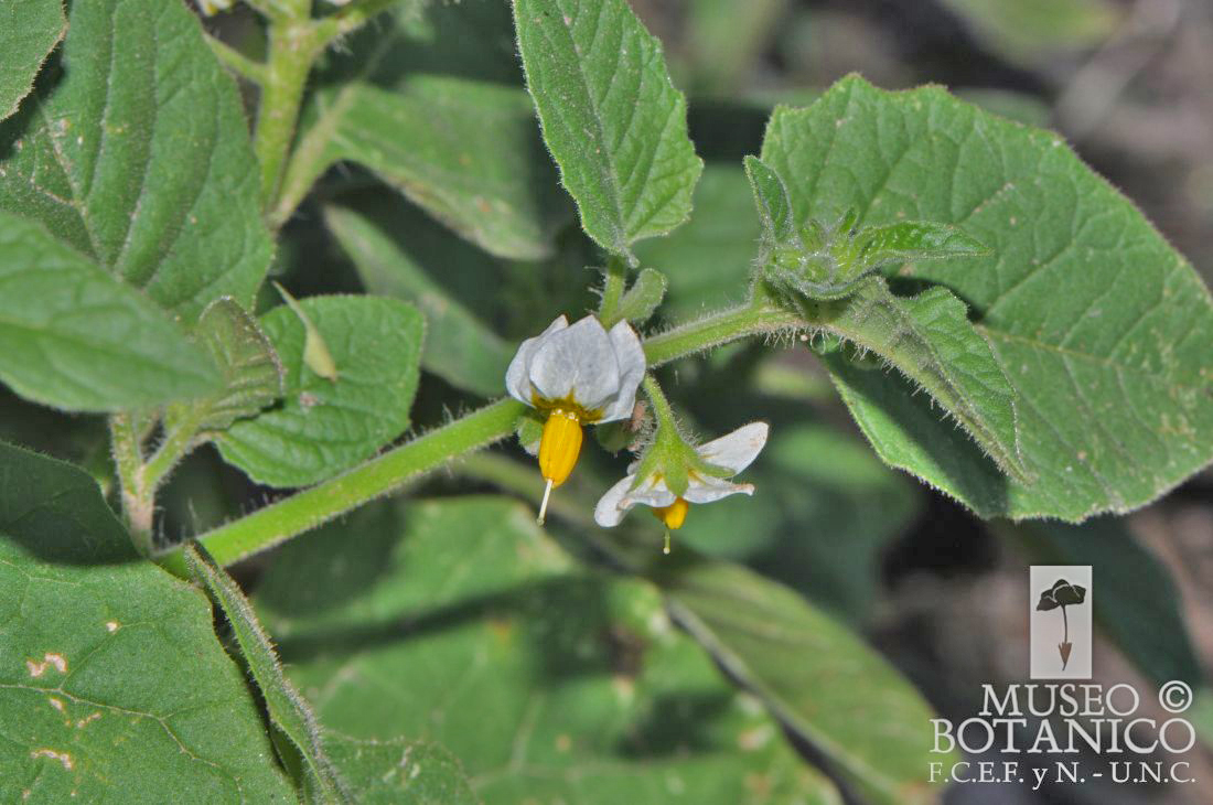 Hierbas perennes, decumbentes, de 0,30-1,5 m de alto, densamente víscido-pubescentes, muy pegajosas al tacto; tallos adultos y jóvenes aristados, con indumento denso de tricomas glandulares (pie pluricelular; cabezuela oblonga 1-celular), flexuosos, ca. 2,3 mm, entremezclados con otros más cortos, ca. 1,5 mm y algunos pocos tricomas eglandulares. Unidades simpodiales 1-foliadas o 2-foliadas. Hojas pecioladas; pecíolos de 1,5-3,5 cm; láminas triangulares, ovadas o anchamente ovadas, de 4-10 × 4-6,5 cm, base truncada, ápice agudo, margen dentado, con 6-9 dientes agudos, subiguales, regularmente distribuidos a ambos lados de la lámina, raro margen entero; epifilo e hipofilo con pubescencia densa de tricomas glandulares, con pocos tricomas eglandulares similares a los presentes en los tallos. Inflorescencia opuesta a las hojas, simple, subumbeliforme a alargada, con 6-8(-10) flores, densamente pubescente, con tricomas similares a la de los tallos y hojas; pedúnculos de 1,5- 2,3 cm. Botones florales ovoides, glanduloso-pubescentes; cicatrices de los pedicelos espaciadas entre 0-2 mm. Pedicelos de 6-12 mm; cáliz campanulado, de (4-)4,5-7(-10) mm, con pubescencia glandular densa, profundamente 5-lobado, lóbulos angostamente elípticos ó angostamente triangulares, de 3,5-5 (-7) × 1,2-1,5 mm, agudos; corola estrellada, de (7-)8-12 mm, blanca, con el centro verdoso y 5 manchitas oscuras o blanca con tintes azulados a violácea, lóbulos triangulares, ca. 7 × 4,5 mm, con tricomas glandulares largos cerca de los nervios medios y otros más cortos en los márgenes; filamentos adheridos a 1,5 mm de la base de la corola, sector libre de 1,2-1,5 mm, pubescente, anteras elipsoides, de (3,8-)4-5 × 0,8-1,3 mm, de color amarillo intenso, gineceo de 6,5-8 mm, ovario subgloboso, glabro, estilo de 5-6,8 mm, sobrepasando a las anteras en 0,5-1,5 mm, pubescente hasta un poco más arriba de su mitad basal, con tricomas eglandulares cortos, estigma ligeramente 2-lobado. Baya globosa, de 5-8 mm de diámetro; pericarpo con o sin pocos esclerosomas; pedicelos fructíferos deflexos, ca. 1-1,3 mm, delgados; cáliz fructífero de aspecto fisaloide, con tubo y lóbulos muy acrescentes que envuelven íntegra y flojamente a la baya; semillas 7-20 por fruto, subglobosas, de 1,5-2 mm, tegumento foveolado.