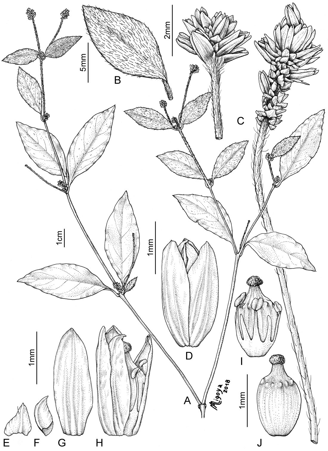Hierbas gráciles, de 0,15-1 m de alto, con tallos ramosos, postrados en la base, con raíces en los nudos, luego curvados hacia arriba, con pubescencia de color blanco. Hojas con pecíolos de 3-10 mm de largo; láminas elípticas u ovadas, de 2-6 × 1-3 cm, agudas, atenuadas, enteras, onduladas, con pocos pelos adpresos en ambas caras. Inflorescencias terminales o axilares, solitarias, espiciformes, ovoides o cilíndricas, de 4-12 × 4-5 mm, sobre pedúnculos delgados hasta de 7 cm de largo, a veces sésiles en las axilas, persistiendo las brácteas y bractéolas en la base cuando caen las flores; brácteas y bractéolas subiguales, ovadas o deltoides, de 0,5-0,8 × 0,4-0,6 mm, agudas, a veces mucronuladas, papiráceas, enteras o denticuladas, glabrescentes o glabras, de color blanquecino. Flores con 5 sépalos similares entre sí, ovado-elípticos, de 1,5-2 × 0,4-0,9 mm, agudos u obtusos, papiráceos, enteros, blancos, glabros o con escasos pelos largos, 1- o 3-nervados, los 2 sépalos internos conduplicados, más angostos; estambres 5, pseudoestaminodios aleznados o laciniados, no alcanzando al ápice de las anteras, anteras de 0,2-0,4 mm de largo; ovario elipsoide, ovoide u obovoide, de 0,3-0,5 × 0,3 mm, estilo de 0,1-0,2 mm de largo, estigma capitado. Frutos obovoides a elipsoides, de 1,1-1,3 × 0,8 mm, de color pardo. Semillas lenticulares, de 0,9-1 × 0,8 mm, de color castaño-rojizo, brillantes.