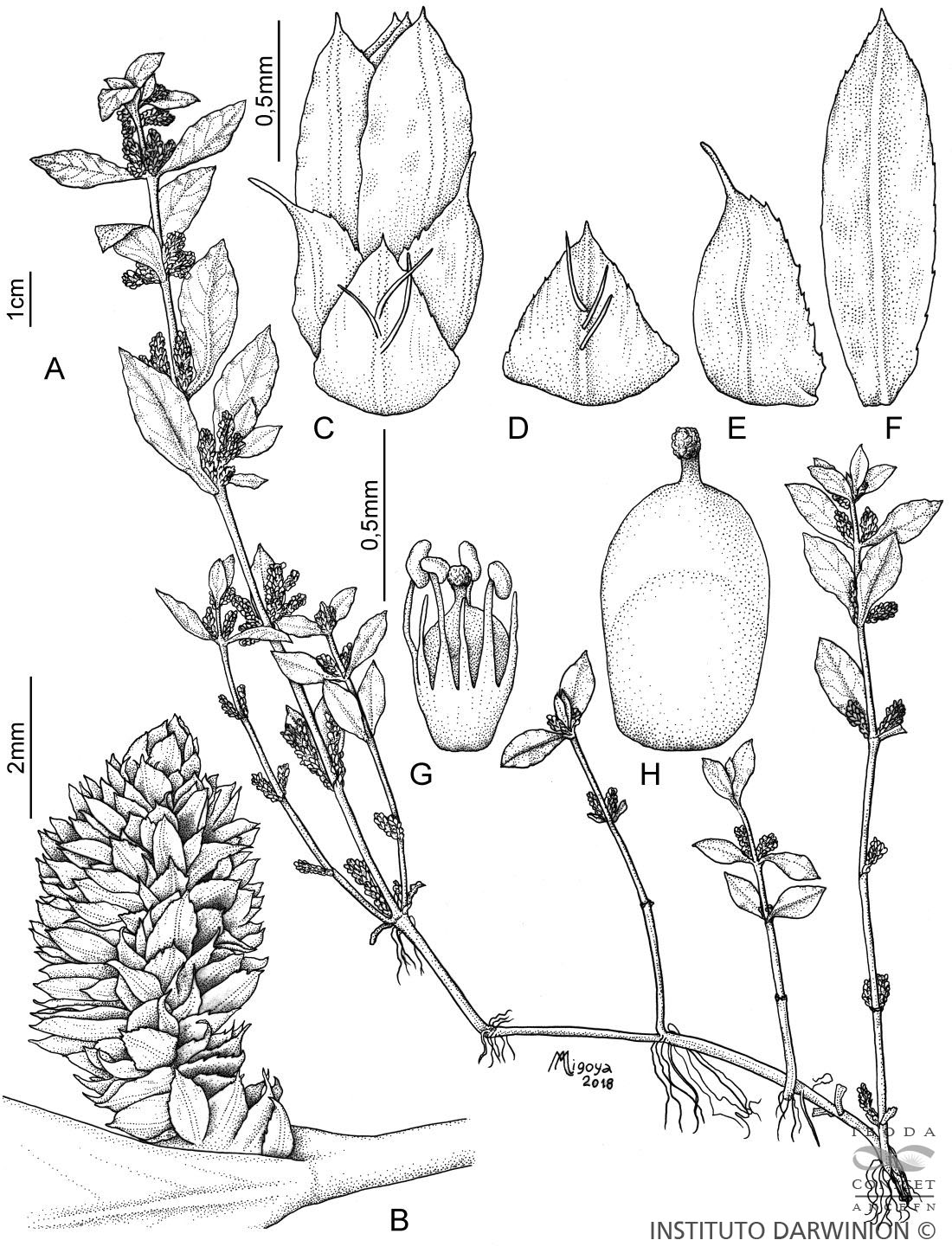 Hierbas anuales, con tallos rastreros radicantes, decumbentes, ascendentes, de 10-40 cm de largo y 10-15 cm de alto, pubescentes. Hojas con pecíolos de 2-7 mm de largo; láminas ovadas o elípticas, de 1-3 × 0,4-1,5 cm, obtusas o agudas, atenuadas, enteras, a veces onduladas, glabrescentes en la cara adaxial, laxamente pilosas en la cara abaxial, con pelos adpresos. Inflorescencias axilares, solitarias o en fascículos, espiciformes, ovoides o cilíndricas, de 0,4-1,2 × 0,3-0,5 cm, sésiles; brácteas y bractéolas ovadas, de 0,7-1 × 0,3-0,4 mm, las brácteas algo menores que las bractéolas, agudas, acuminadas o cuspidadas, mucronadas, escariosas, glabras, con el nervio medio poco marcado, traslúcidas. Flores con 4 sépalos subiguales, oblongos u oblongo-elípticos, de 1,3-1,5 × 0,3-0,5 mm, obtusos, brevemente mucronados, escariosos, enteros, glabros con algunos pelos en la base, 1-nervados, de color blanco o verdoso; estambres 4, pseudoestaminodios apenas más cortos que los filamentos, aleznados, apenas dentados, anteras ovadas, de 0,1-0,2 mm de largo; ovario brevemente estipitado, elíptico, obovoide, de 0,5-0,7 mm de largo, estilo de 0,2-0,3 mm de largo, estigma capitado. Frutos subglobosos ovoides u obovoides, de 1 × 0,5-0,7 mm, membranáceos. Semillas lenticulares, de 0,5-0,7 mm de diámetro, de color castaño-oscuro, brillantes.