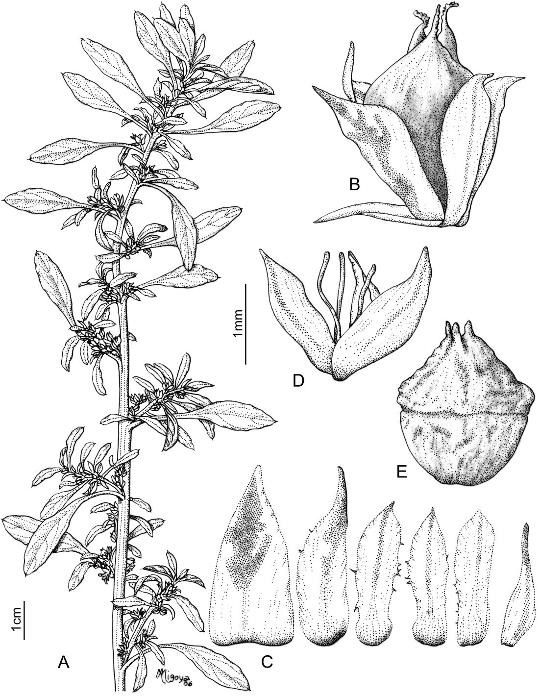 Hierbas anuales; tallos principales ascendentes, raro suberectos, de 20-60 cm de alto, ramificados, glabros. Hojas con pecíolos de 3-25 mm de largo, glabras; láminas de forma variable: lanceoladas, oblongo-lanceoladas, obovadas, elípticas o espatuladas, no onduladas, de 0,7-4 × (0,3-)0,5-1,2 cm, atenuadas a cuneadas en la base, obtusas en el ápice, mucronuladas. Inflorescencias axilares, en glomérulos de 0,4-0,6 cm de diámetro, a veces agrupados en el ápice de los tallos, simulando una inflorescencia terminal hojosa, de color verde; brácteas y bractéolas angostamente oblongas a lanceoladas, de 1,5-2 mm de largo, más cortas, de la misma longitud, o apenas excediendo la longitud de los sépalos, foliáceas, vena media ancha, acuminadas o aristadas. Flores de ambos sexos en una misma inflorescencia. Flores estaminadas con 3(-4) sépalos ovado-acuminados, 1,3-2 mm, estambres 3. Flores pistiladas con (3-)4-5 sépalos, angostamente oblongos, obovados u ovados, de 1-2,5(-4) mm de largo, agudos, usualmente desiguales, el mayor 1,2 a 1,5 veces más largo que la bractéola, con la vena media ramificada, mucrón de 0,2 mm de largo; estigmas 3, de 0,25-0,5 mm de largo. Frutos dehiscentes, casi tan largos como los sépalos, con el pericarpio liso o con el opérculo verrugoso. Semillas de color negro, de 1,3-1,8 mm de diámetro, opacas.