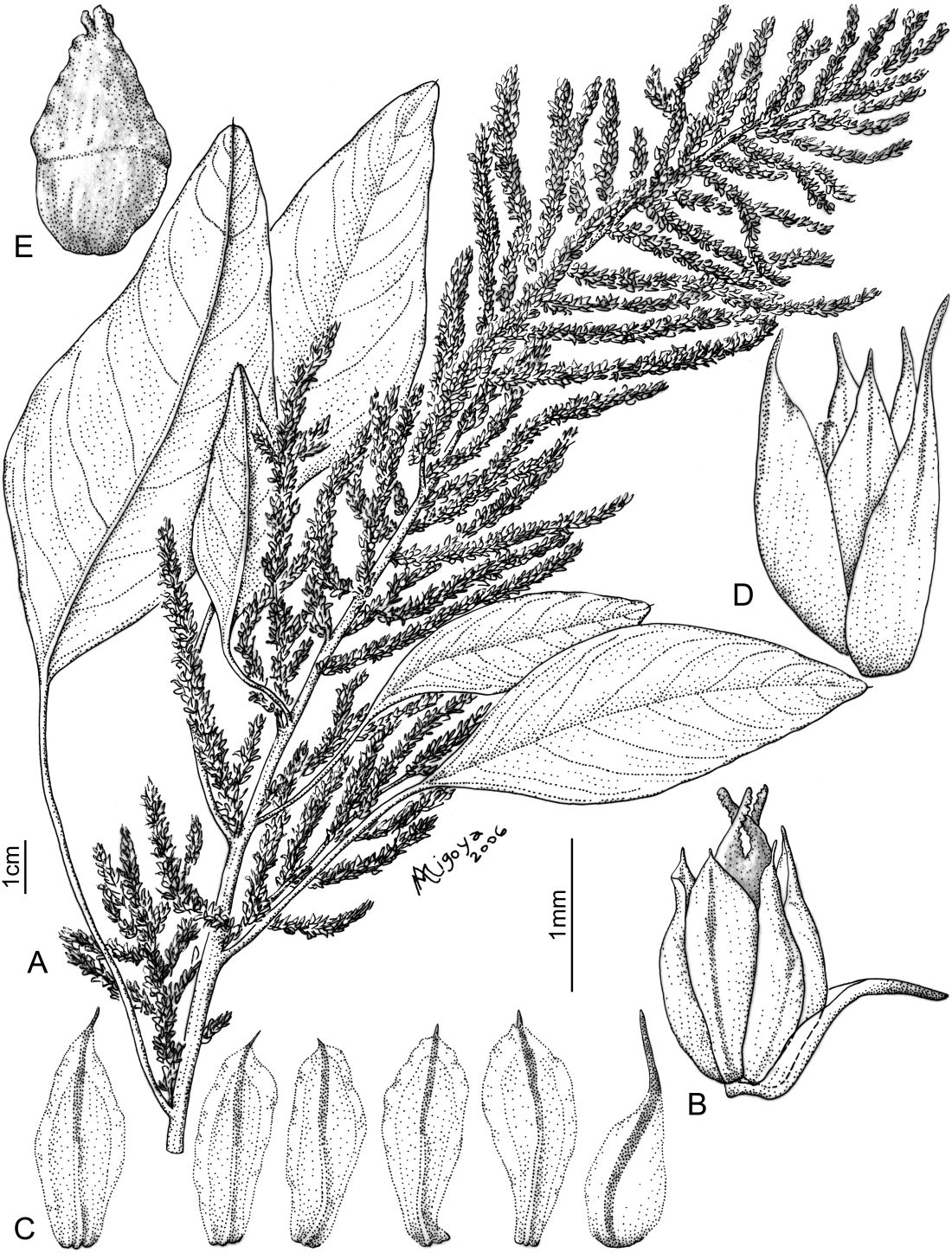 Hierbas anuales; tallos principales usualmente erectos, de 0,3(-1,5) m de alto, delgados a gruesos, simples o ramificados, glabros o corta e inconspicuamente pubescentes cerca de la inflorescencia. Hojas con pecíolos hasta de 8,5 cm de largo, glabras o glabrescentes; láminas ovadas o rómbico-ovadas, no onduladas, de 1,5-8(-12) × 0,7-5(-8) cm, ampliamente cuneadas en la base, obtusas o retusas en el ápice, mucronadas. Inflorescencias terminales y axilares, las primeras en una espiga simple, raro ramificada, de 3-15(-20) × 0,6-0,8(-1) cm, las segundas en glomérulos de 4-10 mm de diámetro, todas ellas de color verdoso; brácteas y bractéolas ovado-deltoides, de 1,3-1,7 mm de largo, más cortas que los sépalos o casi igualándolos, mucronadas. Flores de los glomérulos inferiores enteramente pistiladas, mientras que las espigas terminales muestran en su ápice, a lo largo de ca. 1 cm (o menos) flores estaminadas (también ocasionalmente algunas flores estaminadas pueden estar esparcidas entre las pistiladas). Flores estaminadas con (4-)5 sépalos lanceolados, ovados u oblongo-elípticos, por lo general acuminados, con la vena media de color verde, estambres 5. Flores pistiladas con (4-)5 sépalos angostos, oblongos o elípticos, de 1,5-2,7 mm de largo, agudos con un breve acumen u obtusos, el sépalo externo mayor que los restantes; estigmas 3, de 0,75-1 mm de largo, flexuosos y reflejos. Frutos dehiscentes, lisos o rugosos, con un rostro breve e inflado, casi tan largo como los sépalos o más breve. Semillas de color negruzco a castaño-rojizo oscuro, de 1-1,25 mm de diámetro, apenas reticuladas.