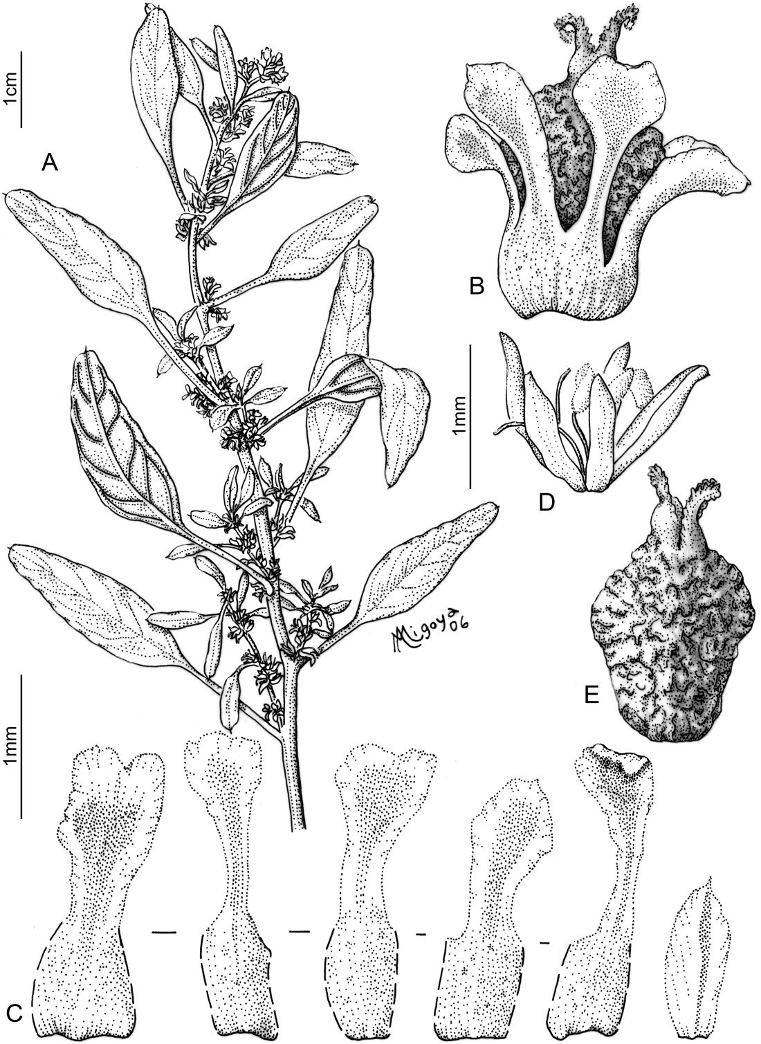 Hierbas anuales; tallos principales erectos, de 40-60 cm de alto, ramificados, glabros en la base, escasamente pubescentes cerca de la inflorescencia. Hojas con pecíolos de 2-10 mm de largo, glabras; láminas lanceoladas a ovado-lanceoladas, no onduladas, de 10-30 × 3-8 mm, atenuadas a cuneadas en la base, estrechándose gradualmente hacia el ápice, redondeadas, algunas veces apenas emarginadas, con un mucrón de 0,3-0,6 mm de largo. Inflorescencias axilares, en glomérulos de 0,5 cm de diámetro aunque a veces tendiendo a reunirse en el ápice 2-3 glomérulos, formando una pseudoespiga de 4 × 0.5 cm; brácteas y bractéolas ovadas a elípticas, de 0,7-1,5 mm de largo, más cortas que los sépalos, membranáceas, con la vena media de color verde, conspicua, cortamente mucronadas. Flores de ambos sexos sobre una misma inflorescencia. Flores estaminadas con 5 sépalos obovados a anchamente oblongos, obtusos, redondeados o emarginados, escariosos, con vena media de color verde, estambres 5. Flores pistiladas urceoladas, con 5 sépalos espatulados, de 1,3-2 mm de largo, con la mitad o el tercio superior reflejo, no superpuestos, expandidos, obtusos, redondeados a emarginados en el ápice, vena media engrosada y usualmente ramificada; fusionados y algo más gruesos en la base en un tramo de 0,3-0,6 mm, diámetro floral en la base de 1-1,5 mm, adelgazándose en la parte media, permitiendo ver el ovario entre ellos; diámetro del cáliz expandido en la porción distal de 1,5-2,5 mm, apenas más corto o más largo que el fruto; estigmas 2, ensanchados en la base, de 0,3 mm de largo. Frutos indehiscentes, rugoso-verrucosos, con la base encerrada dentro del tubo del cáliz. Semillas de color negro, de 0,8-1 × 1-1,1 mm, brillantes en el centro y castaño y reticuladas en el margen.
