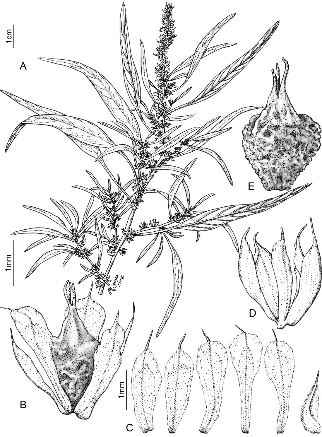 Hierbas anuales; tallos principales erectos, desde pocos cm a 1 m de alto, glabros o glabrescentes, con sólo algunos pelos esparcidos cuando jóvenes. Hojas con pecíolos de 0,2-1,6 cm de largo, glabras; láminas linear a linear-lanceoladas, no onduladas, de 1-6 × 0,2-0,8 cm, atenuadas en la base, agudas o subagudas en el ápice, con mucrón de 0,5 mm de largo. Inflorescencias axilares en glomérulos, a veces reunidos en espigas hojosas; brácteas y bractéolas ovado-deltoides, de 1,3-1,8 mm de largo, ápice acuminado o mucronado. Flores de ambos sexos en la misma inflorescencia. Flores estaminadas con (4-)5 sépalos linear-lanceolados a lanceolados, de 1,8-2,5 mm de largo, subiguales, agudos o subagudos, mucrón de 0,2-0,3 mm de largo, estambres 5. Flores pistiladas con (4-)5 sépalos ampliamente espatulados u obovados, de 1,7-3 mm de largo, 1-nervios, mucrón o arista de 0,25-0,4 mm de largo, los externos adelgazados en una uña en la base de 0,1-0,3 mm de ancho, los internos un tanto menores, a veces sin adelgazamiento basal; estigmas 3, hasta de 1 mm de largo. Frutos indehiscentes, más cortos que los sépalos, pericarpio rugoso, con un rostro que soporta los estigmas. Semillas de color castaño oscuro, de 1,5 × 1,2 mm, brillantes en el área central, más opacas en el margen, que es agudo.