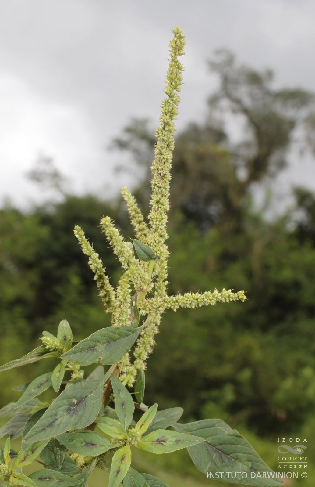 Hierbas anuales; tallos principales erectos, de 0,3-1,5 m de alto, ramificados, glabros a pubescentes en la parte distal de la planta, especialmente cerca de la inflorescencia. Hojas con pecíolo hasta de 7 cm de largo, glabras o glabrescentes, con 2 espinas divaricadas en la axila, hasta de 15 mm de largo, de color verdoso, con el ápice pajizo; láminas ovadas, lanceoladas u oblongas, a menudo rómbicas, no onduladas, de 2-8 × 0,7-3 cm, atenuadas en la base, obtusas o apenas emarginadas en el ápice, con mucrón de 1-1,2 mm de largo. Inflorescencias terminales en panoja, con ramas espiciformes, de color verdoso, o axilares, en glomérulos, a menudo con espinas; brácteas y bractéolas ovadas a ovado-deltoides, con una arista corta y prominente, formada por la vena media excurrente, usualmente más cortas que los sépalos, pero algunas veces iguales o apenas más largas. Flores de los glomérulos axilares enteramente pistiladas, mientras que la inflorescencia terminal presenta sus cimas apicales estaminadas y las basales pistiladas. Flores estaminadas con 5 sépalos oblongo-elípticos a oblongo-obovados, iguales o subiguales, atenuados en el ápice con la vena media excurrente, estambres 5. Flores pistiladas con 5 sépalos espatulado-oblongos, iguales o subiguales, obtusos, mucronulados; estigmas 3, de 1-1,4 mm de largo, con las bases engrosadas. Frutos dehiscentes, lisos o rugosos, del largo de los sépalos. Semillas de 0,8-1,1 mm de diámetro, de color negruzco, brillantes.