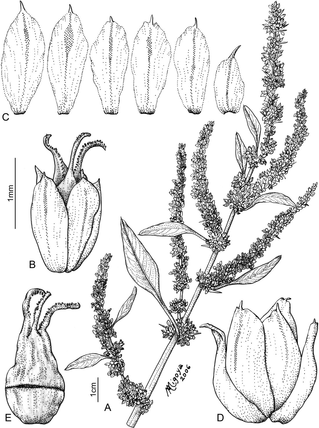Hierbas anuales; tallos principales erectos, de 0,3-1,5 m de alto, ramificados, glabros a pubescentes en la parte distal de la planta, especialmente cerca de la inflorescencia. Hojas con pecíolo hasta de 7 cm de largo, glabras o glabrescentes, con 2 espinas divaricadas en la axila, hasta de 15 mm de largo, de color verdoso, con el ápice pajizo; láminas ovadas, lanceoladas u oblongas, a menudo rómbicas, no onduladas, de 2-8 × 0,7-3 cm, atenuadas en la base, obtusas o apenas emarginadas en el ápice, con mucrón de 1-1,2 mm de largo. Inflorescencias terminales en panoja, con ramas espiciformes, de color verdoso, o axilares, en glomérulos, a menudo con espinas; brácteas y bractéolas ovadas a ovado-deltoides, con una arista corta y prominente, formada por la vena media excurrente, usualmente más cortas que los sépalos, pero algunas veces iguales o apenas más largas. Flores de los glomérulos axilares enteramente pistiladas, mientras que la inflorescencia terminal presenta sus cimas apicales estaminadas y las basales pistiladas. Flores estaminadas con 5 sépalos oblongo-elípticos a oblongo-obovados, iguales o subiguales, atenuados en el ápice con la vena media excurrente, estambres 5. Flores pistiladas con 5 sépalos espatulado-oblongos, iguales o subiguales, obtusos, mucronulados; estigmas 3, de 1-1,4 mm de largo, con las bases engrosadas. Frutos dehiscentes, lisos o rugosos, del largo de los sépalos. Semillas de 0,8-1,1 mm de diámetro, de color negruzco, brillantes.