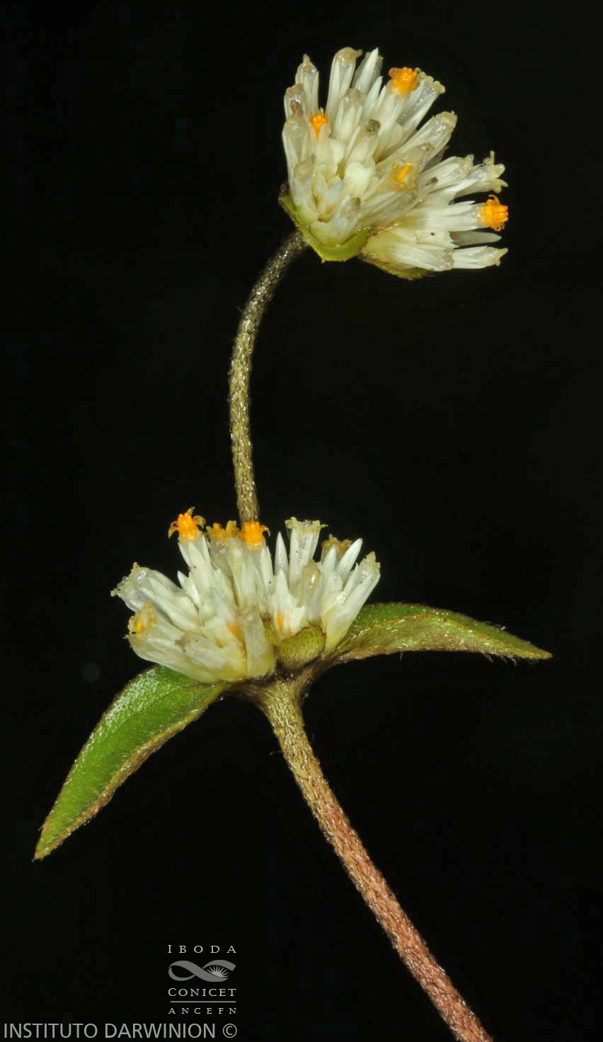 Hierba anual hasta de 0,50 m de alto, más o menos ramosa, erecta desde la base; raíz pivotante de 6-7 cm de largo, debilmente ramificada; tallos hasta de 0,5 cm de grosor, algo teretes a circulares, nudos apenas engrosados, con revestimiento denso de pelos simples, articulados, antrorsos, de 0,1-0,15 cm de largo, ferrugíneos. Hojas opuestas, lanceoladas, mucronadas, de 2,6-7 × 0,8-2 cm, pilosas; pecíolo de 0,3-2,2 cm de largo. Inflorescencias espiciformes reunidas en cabezuelas terminales o axilares, con pedúnculos de 2-10,5 cm de largo y hasta de 1,5 cm de diámetro, con involucro de 4 brácteas foliáceas; bráctea floral de 0,15 cm de largo, ovada, 1-nervada, apiculada, aguda, glabra; bractéolas más cortas que el perianto, de 0,2-0,3 cm de largo, lanceoladas, glabras, naviculares, con una cresta apical laciniado-dentada, la que suele tener más de la mitad del largo de la bractéola, aunque puede ser de solo un tercio. Flores con sépalos subiguales, 1-nervados, de 0,2-0,4 cm de largo, los 3 externos ovadolanceolados, enteros, pilosos en la base; los 2 internos naviculares, con margen ciliado. Estambres con filamentos soldados, formando un tubo estaminal hasta de 0,35 cm de largo, anteras libres de 0,8-1,2 mm de largo, lóbulo anterífero subnulo, apéndices interestaminales ligulados. Ovario subgloboso, de 0,5 mm de diámetro; estilo breve, estigma bífido de 1 mm de largo. Fruto utrículo membranáceo. Semilla lenticular, hasta de 1 mm de largo.