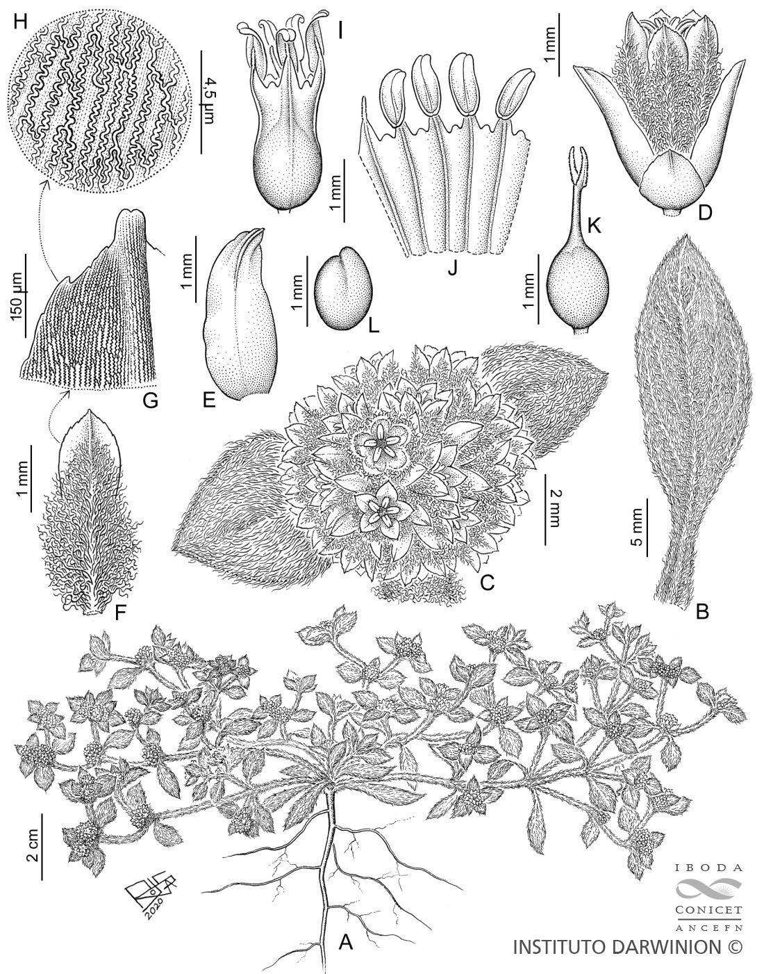 A. Planta. B. Hoja. C. Inflorescencia. D. Flor con bráctea y bractéolas. E. Bractéola. F. Sépalo. G. Ápice de sépalo. H. Células epidérmicas. I. Tubo estaminal (en su interior está delineado el gineceo). J. Tubo estaminal desplegado sin una antera. K. Gineceo. L. Semilla.
