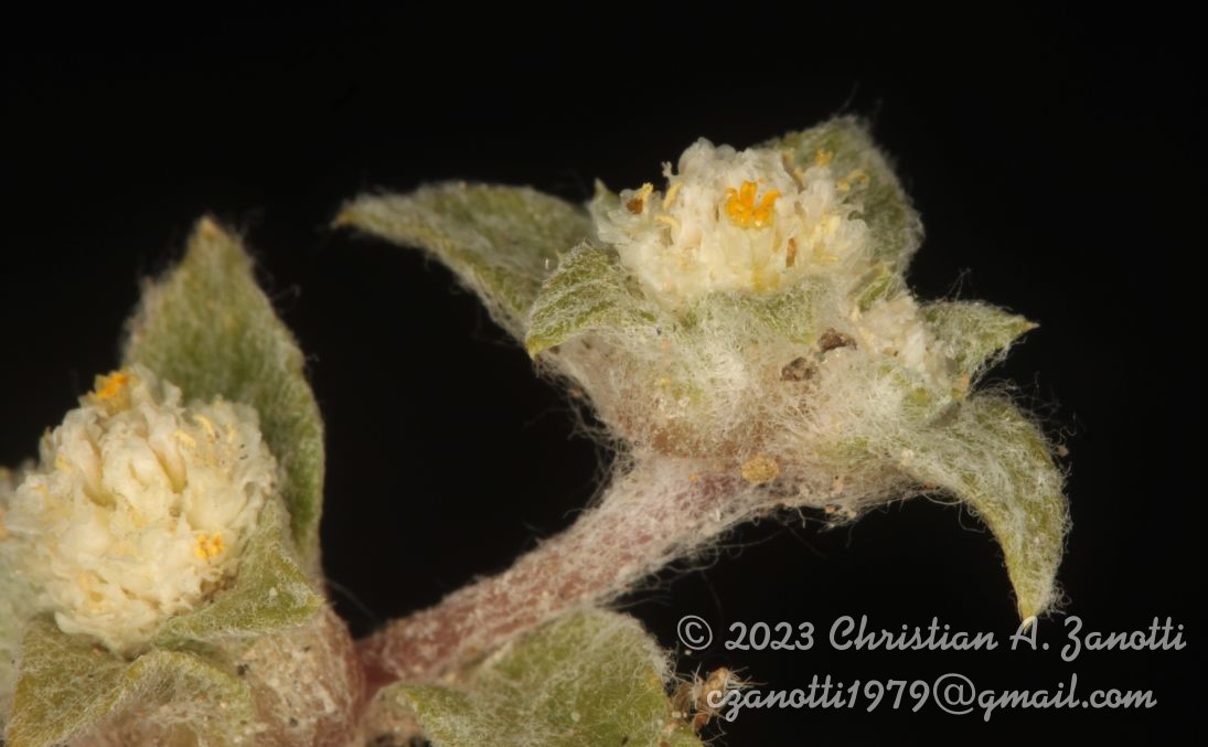 Hierba anual, tallo principal reducido a un braquiblasto con una roseta de hojas efímeras, de cuyas axilas salen los tallos floríferos; éstos decumbentes, ramificados, lanosos hasta algodonosos. Hojas basales lanceoladas u oblanceoladas, de 2-5 cm de largo, incluido el pecíolo de 1/3 -1/2 del largo total; hojas caulinares más cortas y proporcionalmente más anchas, pecíolo breve o indistintamente pecioladas, ovadas o anchamente lanceoladas y a menudo algo falcadas, mucronadas, hirsutas en la cara adaxial y velludas en la abaxial. Inflorescencias en espigas terminales, 5-15 floras, involucradas; bráctea floral escariosa, sin nervios aparentes, peludas hasta hirsutas en el dorso; bractéolas de la misma consistencia que la bráctea o algo más tiernas, glabras o por excepción con algunos pelos en el dorso. Flores con sépalos escariosos, angosta y largamente obovados hasta espatulados, 1-nervios, mucronados, todos o los 2 interiores abundantemente lanosos en el dorso. Tubo estaminal con los estambres soldados en casi toda su extensión (3/4-5/6), parte libre de los filamentos angostada hacia arriba, ápice redondeado, no lobado. Ovario angostamente ovoide, con estilo breve y estigma angosto, 2-partido, con ramas aleznadas. Fruto utrículo. Semillas pardas, lustrosas. Subsp. mendocina: Sépalos netamente espatulados, todos lanosos en la cara abaxial.