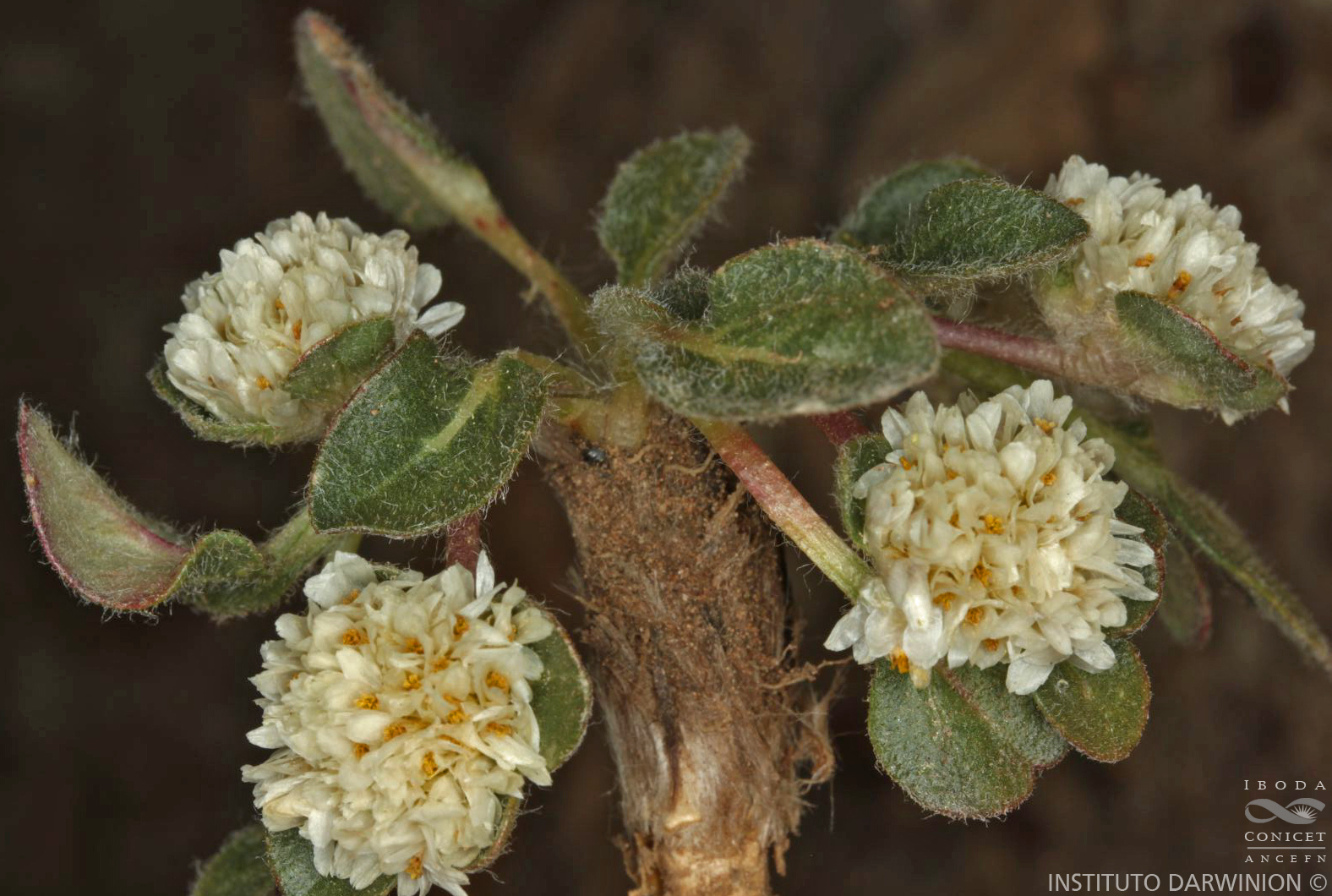 Hierbas perennes, pubescentes; raíz principal subterránea leñosa, vertical, de gran largo y engrosada; tallo principal reducido a un braquiblasto, de mayor grosor que la raíz. Hojas rosuladas simples, lanceoladas a espatuladas, de 1-5,5 × 0,5-2 cm, algo pilosas en la haz y glabras en el envés. Tallos floríferos escaposos (=pedúnculo de la inflorescencia), anuales, hasta de 10 cm de largo; en ocasiones hay tallos floriferos con 1 o 2 nudos de hojas opuestas, simples, ovadas a ovado-lanceoladas, lanosas en la haz y glabras en el envés, lámina de 2 × 0,8 cm; pecíolo de 0,5-1,5 cm de largo. Inflorescencia formada por espigas globosas terminales de 0,5-4 cm de diámetro, pedúnculos de 2 cm de largo, con 4-6 brácteas involucrales foliáceas, lanosas en la haz; bráctea floral ovada, glabra, de 5 mm de largo; bractéolas ovado-lanceoladas, agudas, ecrestadas, glabras, de 6 mm de largo. Flores con sépalos subiguales, blancos, amarillentos o levemente rosados, 1-nervados, espatulados y escariosos en la base, a veces endurecidos a la madurez, de 6 mm de largo. Tubo estaminal ca. 5 mm de largo, parte libre de los filamentos ocasionalmente formando lóbulos laterales; anteras linear-oblongas, de 1,5 mm de largo. Ovario ovoide, de 1,5 mm de largo; estilo de 1 mm de largo y estigma bífido de 1,5 mm de largo. Fruto utriculo, con pericarpo persistente escarioso. Var. meyeniana.- Tallos floríferos escaposos, sin otras hojas que las brácteas foliáceas del involucro; perianto usualmente glabro, aunque algunas veces los sépalos interiores pueden ser pilosos.
