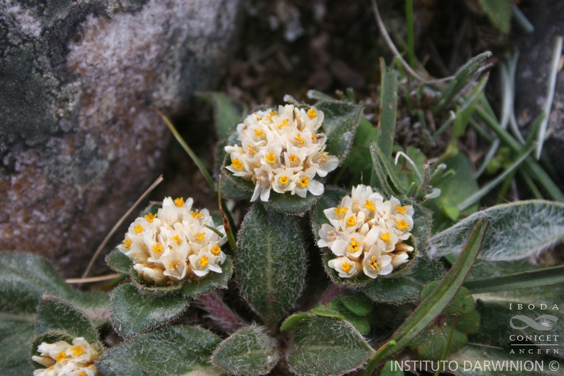 Hierbas perennes, pubescentes; raíz principal subterránea leñosa, vertical, de gran largo y engrosada; tallo principal reducido a un braquiblasto, de mayor grosor que la raíz. Hojas rosuladas simples, lanceoladas a espatuladas, de 1-5,5 × 0,5-2 cm, algo pilosas en la haz y glabras en el envés. Tallos floríferos escaposos (=pedúnculo de la inflorescencia), anuales, hasta de 10 cm de largo; en ocasiones hay tallos floriferos con 1 o 2 nudos de hojas opuestas, simples, ovadas a ovado-lanceoladas, lanosas en la haz y glabras en el envés, lámina de 2 × 0,8 cm; pecíolo de 0,5-1,5 cm de largo. Inflorescencia formada por espigas globosas terminales de 0,5-4 cm de diámetro, pedúnculos de 2 cm de largo, con 4-6 brácteas involucrales foliáceas, lanosas en la haz; bráctea floral ovada, glabra, de 5 mm de largo; bractéolas ovado-lanceoladas, agudas, ecrestadas, glabras, de 6 mm de largo. Flores con sépalos subiguales, blancos, amarillentos o levemente rosados, 1-nervados, espatulados y escariosos en la base, a veces endurecidos a la madurez, de 6 mm de largo. Tubo estaminal ca. 5 mm de largo, parte libre de los filamentos ocasionalmente formando lóbulos laterales; anteras linear-oblongas, de 1,5 mm de largo. Ovario ovoide, de 1,5 mm de largo; estilo de 1 mm de largo y estigma bífido de 1,5 mm de largo. Fruto utriculo, con pericarpo persistente escarioso. Var. meyeniana.- Tallos floríferos escaposos, sin otras hojas que las brácteas foliáceas del involucro; perianto usualmente glabro, aunque algunas veces los sépalos interiores pueden ser pilosos.