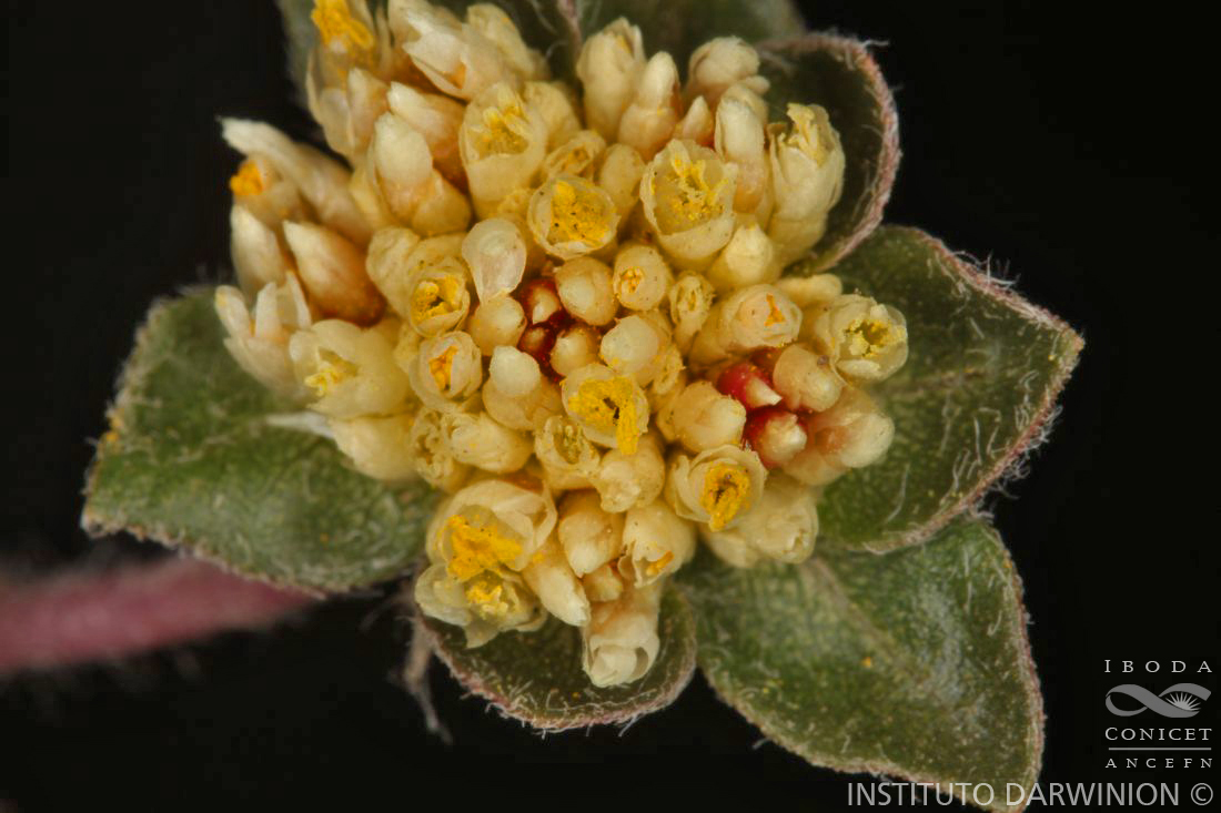 Hierbas perennes, pubescentes; raíz principal subterránea leñosa, vertical, de gran largo y engrosada; tallo principal reducido a un braquiblasto, de mayor grosor que la raíz. Hojas rosuladas simples, lanceoladas a espatuladas, de 1-5,5 × 0,5-2 cm, algo pilosas en la haz y glabras en el envés. Tallos floríferos escaposos (=pedúnculo de la inflorescencia), anuales, hasta de 10 cm de largo; en ocasiones hay tallos floriferos con 1 o 2 nudos de hojas opuestas, simples, ovadas a ovado-lanceoladas, lanosas en la haz y glabras en el envés, lámina de 2 × 0,8 cm; pecíolo de 0,5-1,5 cm de largo. Inflorescencia formada por espigas globosas terminales de 0,5-4 cm de diámetro, pedúnculos de 2 cm de largo, con 4-6 brácteas involucrales foliáceas, lanosas en la haz; bráctea floral ovada, glabra, de 5 mm de largo; bractéolas ovado-lanceoladas, agudas, ecrestadas, glabras, de 6 mm de largo. Flores con sépalos subiguales, blancos, amarillentos o levemente rosados, 1-nervados, espatulados y escariosos en la base, a veces endurecidos a la madurez, de 6 mm de largo. Tubo estaminal ca. 5 mm de largo, parte libre de los filamentos ocasionalmente formando lóbulos laterales; anteras linear-oblongas, de 1,5 mm de largo. Ovario ovoide, de 1,5 mm de largo; estilo de 1 mm de largo y estigma bífido de 1,5 mm de largo. Fruto utriculo, con pericarpo persistente escarioso. Var. meyeniana.- Tallos floríferos escaposos, sin otras hojas que las brácteas foliáceas del involucro; perianto usualmente glabro, aunque algunas veces los sépalos interiores pueden ser pilosos.