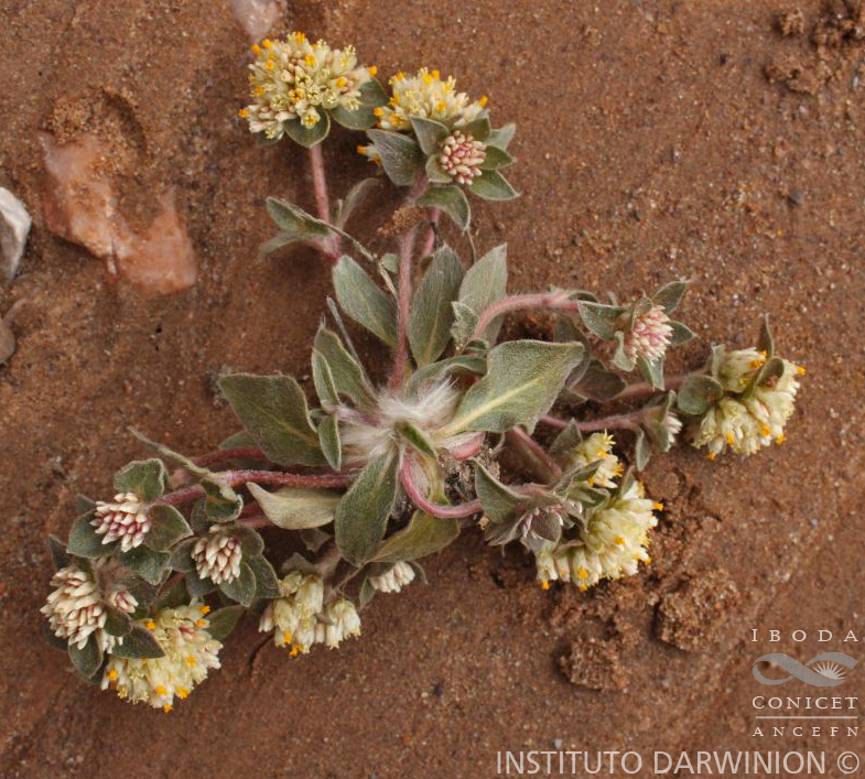 Hierbas perennes, pubescentes; raíz principal subterránea leñosa, vertical, de gran largo y engrosada; tallo principal reducido a un braquiblasto, de mayor grosor que la raíz. Hojas rosuladas simples, lanceoladas a espatuladas, de 1-5,5 × 0,5-2 cm, algo pilosas en la haz y glabras en el envés. Tallos floríferos escaposos (=pedúnculo de la inflorescencia), anuales, hasta de 10 cm de largo; en ocasiones hay tallos floriferos con 1 o 2 nudos de hojas opuestas, simples, ovadas a ovado-lanceoladas, lanosas en la haz y glabras en el envés, lámina de 2 × 0,8 cm; pecíolo de 0,5-1,5 cm de largo. Inflorescencia formada por espigas globosas terminales de 0,5-4 cm de diámetro, pedúnculos de 2 cm de largo, con 4-6 brácteas involucrales foliáceas, lanosas en la haz; bráctea floral ovada, glabra, de 5 mm de largo; bractéolas ovado-lanceoladas, agudas, ecrestadas, glabras, de 6 mm de largo. Flores con sépalos subiguales, blancos, amarillentos o levemente rosados, 1-nervados, espatulados y escariosos en la base, a veces endurecidos a la madurez, de 6 mm de largo. Tubo estaminal ca. 5 mm de largo, parte libre de los filamentos ocasionalmente formando lóbulos laterales; anteras linear-oblongas, de 1,5 mm de largo. Ovario ovoide, de 1,5 mm de largo; estilo de 1 mm de largo y estigma bífido de 1,5 mm de largo. Fruto utriculo, con pericarpo persistente escarioso. Var. caulescens.-Tallos floríferos con al menos un par de hojas en los ¾ basales de su largo; perianto variable en pilosidad, desde sépalos completamente glabros hasta totalmente pilosos.- Tallos floríferos notablemente erguidos.