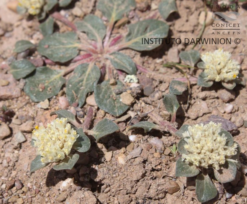 Hierbas perennes, pubescentes; raíz principal subterránea leñosa, vertical, de gran largo y engrosada; tallo principal reducido a un braquiblasto, de mayor grosor que la raíz. Hojas rosuladas simples, lanceoladas a espatuladas, de 1-5,5 × 0,5-2 cm, algo pilosas en la haz y glabras en el envés. Tallos floríferos escaposos (=pedúnculo de la inflorescencia), anuales, hasta de 10 cm de largo; en ocasiones hay tallos floriferos con 1 o 2 nudos de hojas opuestas, simples, ovadas a ovado-lanceoladas, lanosas en la haz y glabras en el envés, lámina de 2 × 0,8 cm; pecíolo de 0,5-1,5 cm de largo. Inflorescencia formada por espigas globosas terminales de 0,5-4 cm de diámetro, pedúnculos de 2 cm de largo, con 4-6 brácteas involucrales foliáceas, lanosas en la haz; bráctea floral ovada, glabra, de 5 mm de largo; bractéolas ovado-lanceoladas, agudas, ecrestadas, glabras, de 6 mm de largo. Flores con sépalos subiguales, blancos, amarillentos o levemente rosados, 1-nervados, espatulados y escariosos en la base, a veces endurecidos a la madurez, de 6 mm de largo. Tubo estaminal ca. 5 mm de largo, parte libre de los filamentos ocasionalmente formando lóbulos laterales; anteras linear-oblongas, de 1,5 mm de largo. Ovario ovoide, de 1,5 mm de largo; estilo de 1 mm de largo y estigma bífido de 1,5 mm de largo. Fruto utriculo, con pericarpo persistente escarioso. Var. caulescens.-Tallos floríferos con al menos un par de hojas en los ¾ basales de su largo; perianto variable en pilosidad, desde sépalos completamente glabros hasta totalmente pilosos.- Tallos floríferos notablemente erguidos.
