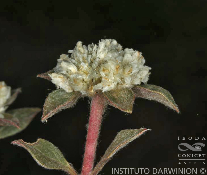 Hierbas perennes, pubescentes; raíz principal subterránea leñosa, vertical, de gran largo y engrosada; tallo principal reducido a un braquiblasto, de mayor grosor que la raíz. Hojas rosuladas simples, lanceoladas a espatuladas, de 1-5,5 × 0,5-2 cm, algo pilosas en la haz y glabras en el envés. Tallos floríferos escaposos (=pedúnculo de la inflorescencia), anuales, hasta de 10 cm de largo; en ocasiones hay tallos floriferos con 1 o 2 nudos de hojas opuestas, simples, ovadas a ovado-lanceoladas, lanosas en la haz y glabras en el envés, lámina de 2 × 0,8 cm; pecíolo de 0,5-1,5 cm de largo. Inflorescencia formada por espigas globosas terminales de 0,5-4 cm de diámetro, pedúnculos de 2 cm de largo, con 4-6 brácteas involucrales foliáceas, lanosas en la haz; bráctea floral ovada, glabra, de 5 mm de largo; bractéolas ovado-lanceoladas, agudas, ecrestadas, glabras, de 6 mm de largo. Flores con sépalos subiguales, blancos, amarillentos o levemente rosados, 1-nervados, espatulados y escariosos en la base, a veces endurecidos a la madurez, de 6 mm de largo. Tubo estaminal ca. 5 mm de largo, parte libre de los filamentos ocasionalmente formando lóbulos laterales; anteras linear-oblongas, de 1,5 mm de largo. Ovario ovoide, de 1,5 mm de largo; estilo de 1 mm de largo y estigma bífido de 1,5 mm de largo. Fruto utriculo, con pericarpo persistente escarioso. Var. flaccida.- Tallos floríferos con al menos un par de hojas en los ¾ basales de su largo; perianto variable en pilosidad, desde sépalos completamente glabros hasta totalmente pilosos.- Tallos floríferos decumbentes.