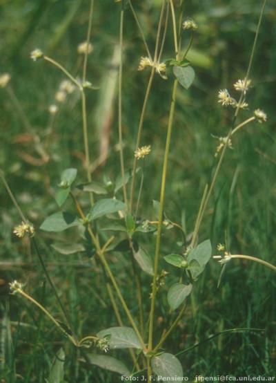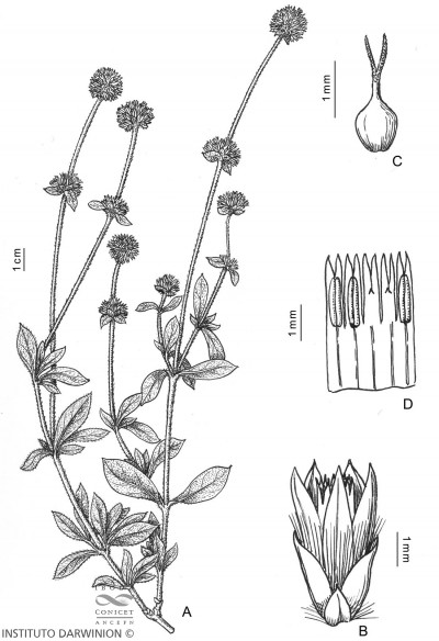 Hierba perenne, erguida a algo decumbente, de 50 cm o más de alto; tallo de 1,5-3,5 mm de diámetro, terete (salvo las ramificaciones de la inflorescencia), algo engrosado en los nudos, más o menos densamente revestido de pelos de 0,5-1 mm de largo, simples, amarillentos o blanquecinos, antrorso-adpresos. Hojas con pecíolo de 1-5 mm de largo; lámina usualmente elíptica, generalmente de 1-5 × 0,5-2,5 cm, aguda, con indumento denso de pelos adpresos ca. 1 mm de largo. Inflorescencia en espigas globosas densas, sostenidas por brácteas foliáceas ovadas más cortas, agrupadas a su vez en una inflorescencia espiciforme generalmente ramificada, terminada en un fascículo con involucro de brácteas foliáceas, ovado-orbiculares u ovadas, brevísimamente acuminadas hasta agudas; bráctea floral escariosa, de 1-2 mm de largo, ovada, aguda, glabra; bractéolas de 3,5-5 mm de largo, ovadas, agudas, muy cóncavas, con una cresta dentada de ancho variable entre el 1/4 y 1/3 superior del dorso. Flores con sépalos escariosos, amarillento-rojizos, raramente blancos o rojizos, de 4,5-7 mm de largo, más largos que las bractéolas, oblongos o alargado-ovados, agudos o subagudos, generalmente enteros. Estambres a menudo más largos que el perianto cuando maduros, con anteras lineares, de 1,5-2 mm de largo, filamentos connados en los 3/4-4/5 inferiores, parte libre 2-lobada, lóbulo anterífero subnulo, lóbulos laterales oblongos, agudos, enteros o casi enteros, alcanzando el ápice de las anteras o más cortos. Ovario ca. 0,7 mm de largo, con estilo ca. 0,2 mm y estigma 2-partido, ca. 1,5 mm de largo, con ramas erguidas, filiformes. Fruto utrículo membranáceo. Semilla globosa, ca. 1 mm de diámetro.