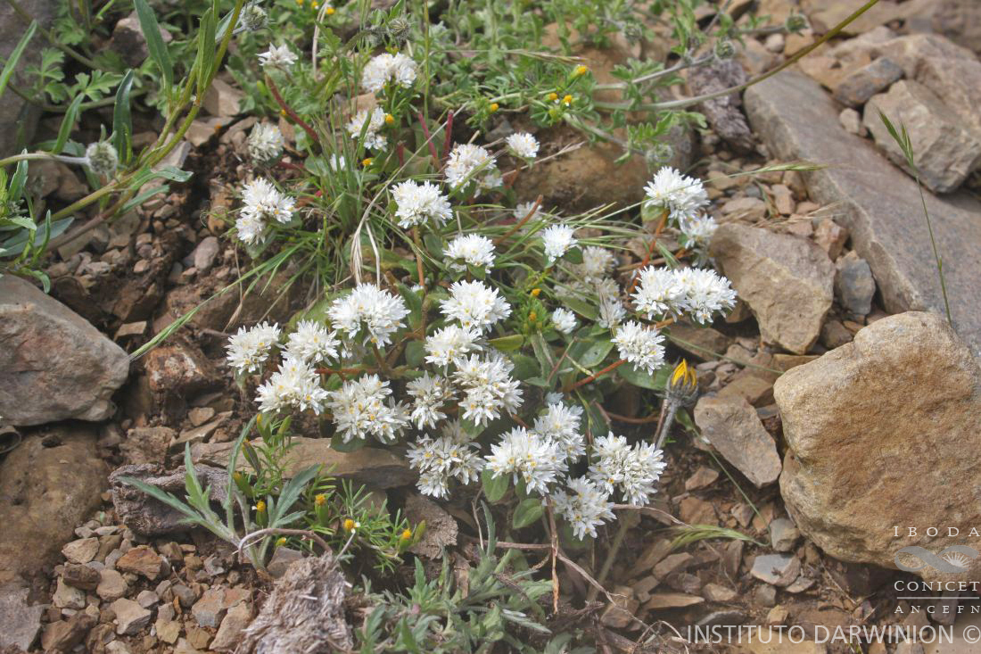Hierba anual, escasamente ramificada, de 15-20 cm de alto; raíz principal no engrosada, hasta de 5 cm de largo, con escasas ramificaciones laterales; tallo terete, de 2-3 mm de diámetro, con aspecto craso sobre todo en la parte cercana al cuello, compuesto por solo 2-5 entrenudos mas o menos alargados, con indumento de pelos articulados, simples, antrorsos, de 1-2 mm de largo, castaños o negros. Hojas opuestas, de 1-3 × 0,7-1,5 cm, las de los nudos basales subsésiles, con un pecíolo alado y envainador, correspondiente a una séptima parte del largo total de la hoja; lámina eliptica, ovado-eliptica o suborbicular, 3-5 nervia, pilosa. Inflorescencias en espigas globosas, terminales y laterales, de 1,5-2 cm de diámetro, dispuestas sobre un tallo no ramificado de aspecto escaposo, con 3-5 brácteas foliáceas de 0,8 cm de largo, orbiculares, dispuestas en forma de involucro; bráctea floral de 2,5-3 mm de largo, ovada, angosta, cóncava, 1-nervada, levemente apiculada, glabra; bractéolas ca. 4,5 mm de largo, superando notablemente al perianto, angostamente ovadas, agudas, naviculares, con una cresta dorsal amplia, dentada, glabra. Flores con sépalos de largo desigual, los 3 externos ca. 3 mm de largo, oblongos, obtusos, de ápice denticulado, los 2 sépalos internos notablemente menores, de la mitad a 2/3 del largo de los exteriores, todos los sépalos 1-nervados, glabros. Estambres formando un tubo estaminal que supera en largo los sépalos exteriores luego de la antesis, anteras libres ca. 1 mm de largo, filamentos connados que superan la inserción de las anteras, formando la parte libre del tubo estaminal, de cada estambre, 2 lóbulos laterales a su correspondiente antera, 2-lobados a emarginados. Ovario globoso, ca. 0,4 mm de diámetro, estilo de 0,5 mm de largo, estigma 2-partido, de 1 mm de largo. Fruto utriculo membranáceo con el estilo persistente. Semilla globosa, castaña.