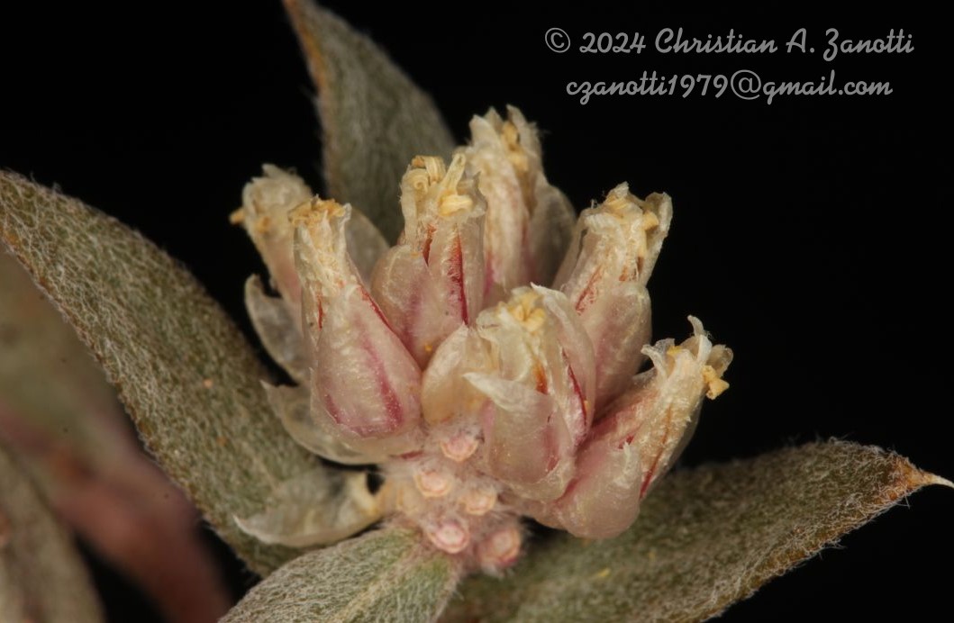 Hierba perenne; raíz axonomorfa, con yemas adventicias en la parte superior, continuada en un cáudice leñoso, ramificado; tallos floríferos de pocos cm de alto, a veces ramificados, entrenudos basales muy breves, alargados en la parte media, terminando en una espiga globosa ca. 1 cm de diámetro. Hojas basales apretadas, linear lanceoladas, de 1-2 × 0,2-0,3 cm, rosuladas, pecioladas a subsésiles, agudas, mucronadas, densamente revestidas de pelos largos, canescentes; hojas de los tallos floríferos ca. 1 cm de largo, alternas u opuestas hacia el ápice del tallo, opuestas, sésiles, lineares o linear-lanceoladas, notablemente mucronadas. Inflorescencias en espigas 10-20-floras, involucradas por las hojas superiores; bráctea floral de 0,2-0,3 cm de largo, orbicular, brevísimamente cuspidada, glabra o densamente peluda (en material de Patagonia); bractéolas de 0,28-0,4 cm de largo, ovado-orbiculares, brevemente acuminadas, cóncavas, sin venas aparentes, glabras. Flores con sépalos de 0,35-0,45 cm de largo, oblongos, truncados o redondeados en el ápice, 3-nervios (nervios laterales poco evidentes), densamente lanosos en la cara abaxial. Estambres a la madurez ± del largo del perianto, anteras de 0,1-0,2 cm de largo, lineares; filamentos soldados en la base, parte libre triangular, sin lóbulos laterales. Ovario ovoide, de 0,6-1 mm de largo; estilo breve, apenas diferenciado y estigma ancho de 0,5-1 mm de largo, bífido. Fruto utrículo encerrado por los sépalos, endurecidos a la madurez.