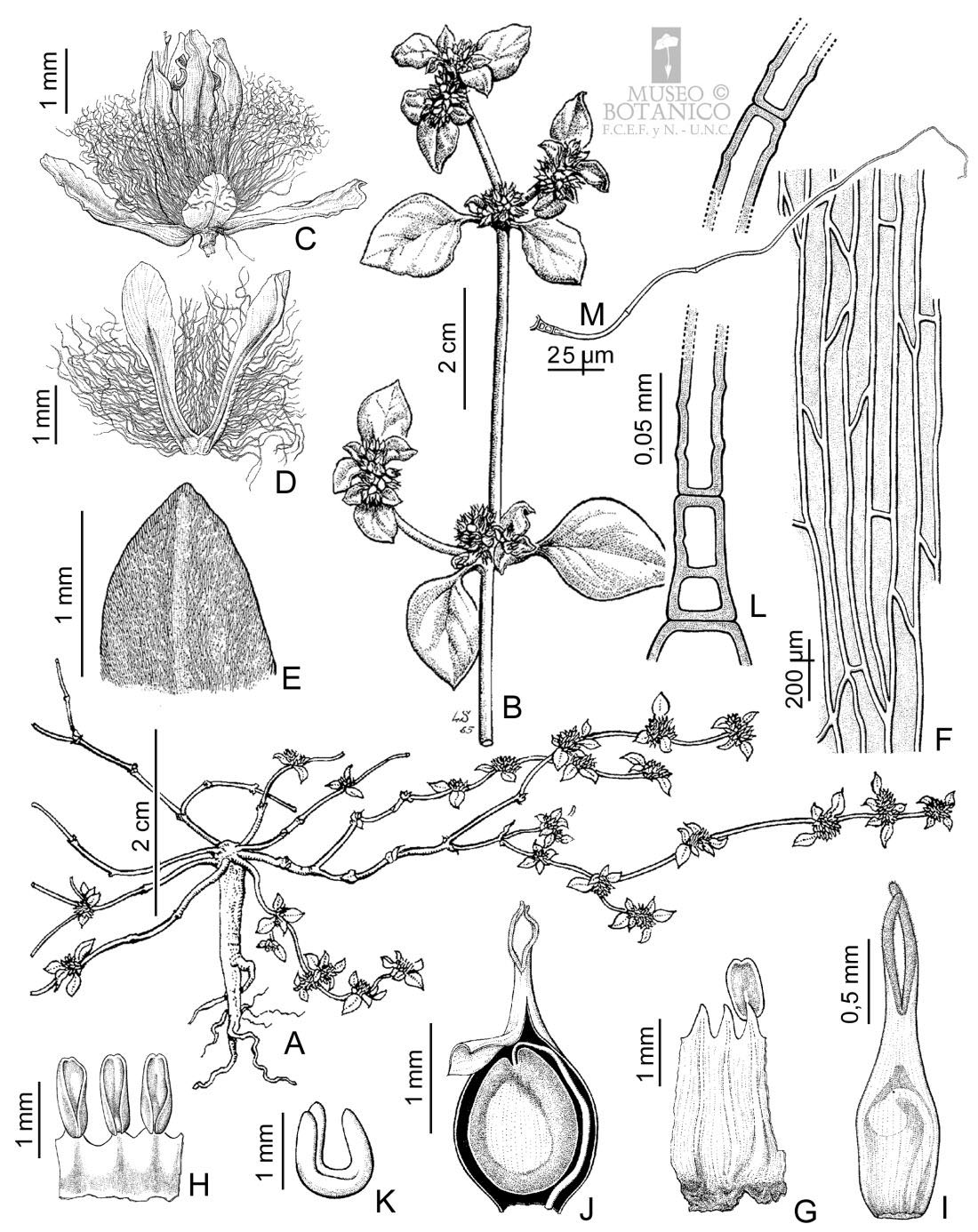 Sufrutice, raíz axonomorfa profunda; tallo principal reducido a un braquiblasto con hojas rosuladas, de 2,5-6,5 cm de largo, pecíolo ? - ½ del largo de la hoja; láminas elípticas a lanceoladas, de 1-2 cm de ancho, agudas, de cuyas axilas nacen las ramificaciones plagiótropas floríferas. Tallos floríferos muy ramificados, hasta de 50 cm de largo, con 1-3 nudos vegetativos cercanos al tallo principal y los restantes reproductivos, terminando cada ramificación en una espiga o cabezuela de espigas terminales, sésiles, entre 2 brácteas foliáceas, de cuyas axilas nacen ramificaciones ulteriores. Hojas de las ramificaciones con pecíolo breve, ovadas, de 1-3,5 × 0,5-2 cm, a menudo asimétricas, agudas o brevemente acuminadas, tomentosas en ambas caras. Inflorescencias en espigas 10-80 o más floras, a menudo reunidas en cabezuelas aplanadas hasta de 2,5 cm de diámetro, frecuentemente de apariencia axilar, por el crecimiento de una de las ramas que nacen en la axila de las 2 brácteas foliáceas, o bien sentadas en bifurcaciones del tallo florífero, por desarrollo de sendas ramas a partir de las yemas de las 2 brácteas foliáceas; bráctea floral de 0,15-0,3 cm de largo, obovado orbicular, generalmente ± pilosa en el dorso; bractéolas de 0,2-0,4 cm de largo, ovadas u oblongas, falcadas, obtusas o subagudas, generalmente glabras. Flores con sépalos subiguales, connados en la base, de 0,3-0,45 cm de largo, alargado-espatulados, más bien obtusos, 3-nervados, dorso con indumento lanoso de color castaño; estambres del largo del perianto, o un poco más largos, con anteras de 0,7-1,5 mm de largo, filamentos soldados en aprox. las ? partes inferiores, parte libre superior algo angostada hacia arriba, no lobada, uniones entre filamentos libres sin apéndices interestaminales, generalmente anchos y redondeados. Ovario angostamente ovoide, con estilo poco diferenciado y estigma 2-partido, de 0,5-1 mm de largo. Fruto angostamente ovoide, hasta de 2 mm de largo, sin el estilo persistente, atenuado hacia el ápice. Var. tomentosa.- Inflorescencia con 20 a 80 o más flores; epifilo velloso, con tricomas flexuosos entrelazados y con forma de látigo.