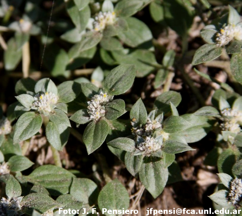 Sufrutice, raíz axonomorfa profunda; tallo principal reducido a un braquiblasto con hojas rosuladas, de 2,5-6,5 cm de largo, pecíolo ? - ½ del largo de la hoja; láminas elípticas a lanceoladas, de 1-2 cm de ancho, agudas, de cuyas axilas nacen las ramificaciones plagiótropas floríferas. Tallos floríferos muy ramificados, hasta de 50 cm de largo, con 1-3 nudos vegetativos cercanos al tallo principal y los restantes reproductivos, terminando cada ramificación en una espiga o cabezuela de espigas terminales, sésiles, entre 2 brácteas foliáceas, de cuyas axilas nacen ramificaciones ulteriores. Hojas de las ramificaciones con pecíolo breve, ovadas, de 1-3,5 × 0,5-2 cm, a menudo asimétricas, agudas o brevemente acuminadas, tomentosas en ambas caras. Inflorescencias en espigas 10-80 o más floras, a menudo reunidas en cabezuelas aplanadas hasta de 2,5 cm de diámetro, frecuentemente de apariencia axilar, por el crecimiento de una de las ramas que nacen en la axila de las 2 brácteas foliáceas, o bien sentadas en bifurcaciones del tallo florífero, por desarrollo de sendas ramas a partir de las yemas de las 2 brácteas foliáceas; bráctea floral de 0,15-0,3 cm de largo, obovado orbicular, generalmente ± pilosa en el dorso; bractéolas de 0,2-0,4 cm de largo, ovadas u oblongas, falcadas, obtusas o subagudas, generalmente glabras. Flores con sépalos subiguales, connados en la base, de 0,3-0,45 cm de largo, alargado-espatulados, más bien obtusos, 3-nervados, dorso con indumento lanoso de color castaño; estambres del largo del perianto, o un poco más largos, con anteras de 0,7-1,5 mm de largo, filamentos soldados en aprox. las ? partes inferiores, parte libre superior algo angostada hacia arriba, no lobada, uniones entre filamentos libres sin apéndices interestaminales, generalmente anchos y redondeados. Ovario angostamente ovoide, con estilo poco diferenciado y estigma 2-partido, de 0,5-1 mm de largo. Fruto angostamente ovoide, hasta de 2 mm de largo, sin el estilo persistente, atenuado hacia el ápice. Var. ruiz-lealii.- Inflorescencia con 10 a 20 flores; epifilo hirsuto, con tricomas rígidos, adpresos.