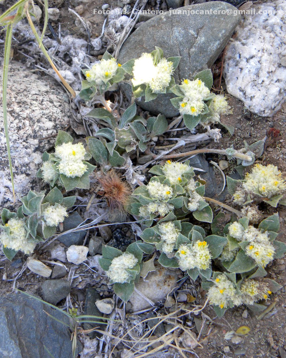 Sufrutice, raíz axonomorfa profunda; tallo principal reducido a un braquiblasto con hojas rosuladas, de 2,5-6,5 cm de largo, pecíolo ? - ½ del largo de la hoja; láminas elípticas a lanceoladas, de 1-2 cm de ancho, agudas, de cuyas axilas nacen las ramificaciones plagiótropas floríferas. Tallos floríferos muy ramificados, hasta de 50 cm de largo, con 1-3 nudos vegetativos cercanos al tallo principal y los restantes reproductivos, terminando cada ramificación en una espiga o cabezuela de espigas terminales, sésiles, entre 2 brácteas foliáceas, de cuyas axilas nacen ramificaciones ulteriores. Hojas de las ramificaciones con pecíolo breve, ovadas, de 1-3,5 × 0,5-2 cm, a menudo asimétricas, agudas o brevemente acuminadas, tomentosas en ambas caras. Inflorescencias en espigas 10-80 o más floras, a menudo reunidas en cabezuelas aplanadas hasta de 2,5 cm de diámetro, frecuentemente de apariencia axilar, por el crecimiento de una de las ramas que nacen en la axila de las 2 brácteas foliáceas, o bien sentadas en bifurcaciones del tallo florífero, por desarrollo de sendas ramas a partir de las yemas de las 2 brácteas foliáceas; bráctea floral de 0,15-0,3 cm de largo, obovado orbicular, generalmente ± pilosa en el dorso; bractéolas de 0,2-0,4 cm de largo, ovadas u oblongas, falcadas, obtusas o subagudas, generalmente glabras. Flores con sépalos subiguales, connados en la base, de 0,3-0,45 cm de largo, alargado-espatulados, más bien obtusos, 3-nervados, dorso con indumento lanoso de color castaño; estambres del largo del perianto, o un poco más largos, con anteras de 0,7-1,5 mm de largo, filamentos soldados en aprox. las ? partes inferiores, parte libre superior algo angostada hacia arriba, no lobada, uniones entre filamentos libres sin apéndices interestaminales, generalmente anchos y redondeados. Ovario angostamente ovoide, con estilo poco diferenciado y estigma 2-partido, de 0,5-1 mm de largo. Fruto angostamente ovoide, hasta de 2 mm de largo, sin el estilo persistente, atenuado hacia el ápice. Var. ruiz-lealii.- Inflorescencia con 10 a 20 flores; epifilo hirsuto, con tricomas rígidos, adpresos.