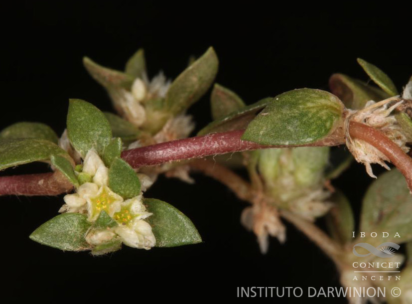 Hierbas perennes, rastreras, hasta de 80 cm de largo, pubescentes; raíz principal leñosa, napiforme, con su porción proximal diferencialmente engrosada; tallo principal reducido a un braquiblasto con hojas rosuladas, espatuladas, ausentes a la madurez. Tallos floríferos pubescentes, de 1-1,5 mm de diámetro, de largo variable, muy ramificados, terminando cada ramificación en una inflorescencia. Hojas de los tallos floríferos opuestas, con pecíolo alado, breve, de 3-7 mm de largo; láminas lanceoladas, elípticas u ovadas, de 5-20 × 4-10 mm, de ápice obtuso, margen entero, pubescentes en el envés. Inflorescencias: espigas globosas, densas, sésiles, 5-12 floras, sostenidas por 2-4 brácteas foliáceas ovadas u obovadas, agrupadas a su vez en una inflorescencia espiciforme, generalmente ramificada; bráctea floral membranácea, ovado-orbicular, hasta de 2 mm de largo; bractéolas escariosas, oblongo-ovadas, hasta de 2,5 mm de largo. Flores perfectas, larga a brevemente pediceladas, sépalos 5, iguales, de 1-2,5 mm de largo, blancos, membranáceos, elípticos, soldados hasta la mitad, el dorso lanoso, con abundantes pelos de color cremoso o castaños, nervio central engrosado, que alcanza hasta ¾ de la longitud del sépalo, nervios comisurales con frecuencia evidentes a la madurez; estambres 5, de 0,5-1,8 mm de largo, llegando hasta ½ - ¾ de la longitud del perianto, anteras de 0,1-0,4 mm de largo, filamentos connados en la mitad inferior, de 0,2-1 mm de largo; ovario elipsoide, de 0,5-1 mm de largo, estilo persistente superando en longitud a los estambres, estigma emarginado. Fruto utrículo elipsoide, de 2 × 1 mm. Semilla lenticular de color castaño, ca.1 mm de diámetro.