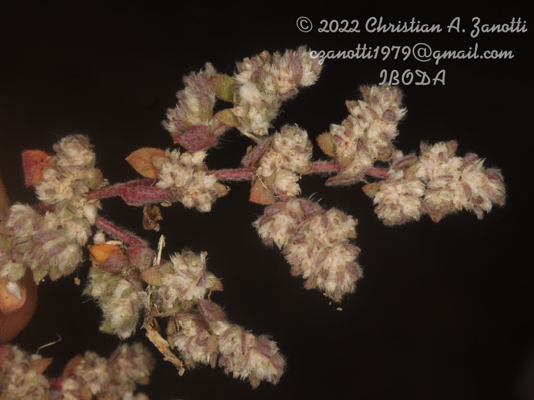 Hierbas perennes, rastreras, hasta de 80 cm de largo, pubescentes; raíz principal leñosa, napiforme, con su porción proximal diferencialmente engrosada; tallo principal reducido a un braquiblasto con hojas rosuladas, espatuladas, ausentes a la madurez. Tallos floríferos pubescentes, de 1-1,5 mm de diámetro, de largo variable, muy ramificados, terminando cada ramificación en una inflorescencia. Hojas de los tallos floríferos opuestas, con pecíolo alado, breve, de 3-7 mm de largo; láminas lanceoladas, elípticas u ovadas, de 5-20 × 4-10 mm, de ápice obtuso, margen entero, pubescentes en el envés. Inflorescencias: espigas globosas, densas, sésiles, 5-12 floras, sostenidas por 2-4 brácteas foliáceas ovadas u obovadas, agrupadas a su vez en una inflorescencia espiciforme, generalmente ramificada; bráctea floral membranácea, ovado-orbicular, hasta de 2 mm de largo; bractéolas escariosas, oblongo-ovadas, hasta de 2,5 mm de largo. Flores perfectas, larga a brevemente pediceladas, sépalos 5, iguales, de 1-2,5 mm de largo, blancos, membranáceos, elípticos, soldados hasta la mitad, el dorso lanoso, con abundantes pelos de color cremoso o castaños, nervio central engrosado, que alcanza hasta ¾ de la longitud del sépalo, nervios comisurales con frecuencia evidentes a la madurez; estambres 5, de 0,5-1,8 mm de largo, llegando hasta ½ - ¾ de la longitud del perianto, anteras de 0,1-0,4 mm de largo, filamentos connados en la mitad inferior, de 0,2-1 mm de largo; ovario elipsoide, de 0,5-1 mm de largo, estilo persistente superando en longitud a los estambres, estigma emarginado. Fruto utrículo elipsoide, de 2 × 1 mm. Semilla lenticular de color castaño, ca.1 mm de diámetro.