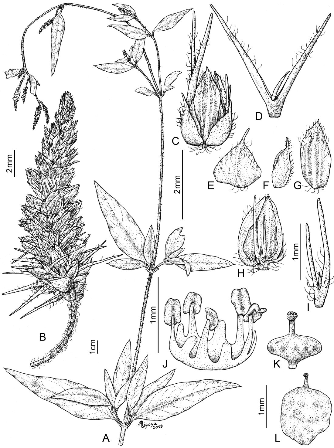 Hierbas perennes, sufrútices o arbustos de 0,70-1 m de largo; raíz leñosa; tallos rastreros, apoyantes o erguidos, ramificados hacia el ápice, estriados, pubescentes, de color rojizo. Hojas con pecíolos de 0,5-1,5 cm de largo; láminas ovadas, de 2-10 × 0,5-3 cm, cuneadas, agudas, mucronadas, enteras, ambas caras pubescentes. Inflorescencias en pseudoespigas axilares y terminales, de 1-3 × 0,3-0,8 cm, pubescentes; pedúnculos de 2-5 cm de largo; inflorescencia elemental (címula) 2-3-flora, con una flor perfecta y las restantes transformadas en aristas rectas, las laterales de 1-4 mm de largo y la central rudimentaria, ca. 0,5 mm; bráctea anchamente triangular, de 2 mm de largo, acuminada, bractéolas ovadas, de 1,5-2 mm de largo, mucronadas, pubescentes. Flores perfectas con 5 sépalos iguales, ovados, de 3-4 mm de largo, 3-nervados, acuminados, mucronados, escariosos, enteros, algo pilosos en el dorso, blanco-verdosos, verdes o blanquecinos; estambres con los filamentos soldados en el 1/3 inferior, alternando con 5 pseudoestaminodios redondeados; ovario globoso, estilo breve, ca. 0,3 mm de largo, estigma capitado. Frutos ovoides, engrosados en la parte superior. Semillas globosas, de 1,5 ×1 ×1 mm, de color castaño.