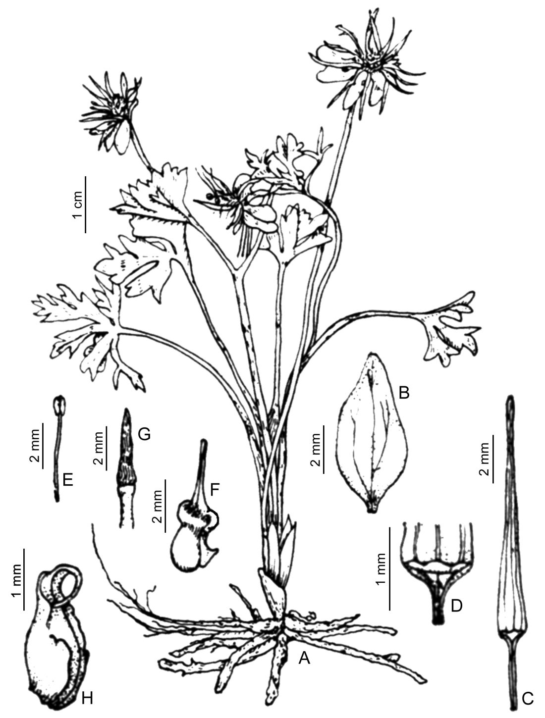 A. Planta. B. Sépalo. C. Pétalo. D. Escama nectarífera. E. Estambre. F. Carpelo. G. Receptáculo. H. Aquenio inmaduro.