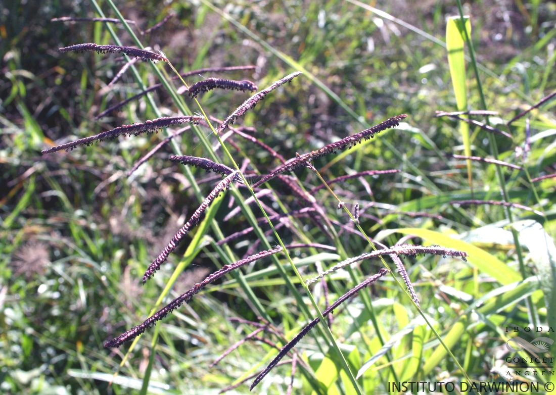 Plantas perennes, robustas, formando matas densas; cañas de 1-1,5 m de alto y 4-6 mm de diámetro, simples, erguidas a decumbentes; entrenudos de 10-20 cm de largo, subcilíndricos a comprimidos, estriados, glabros; nudos castaños, hirsutos a glabros; vainas de 20-25 cm de largo, mayores que los entrenudos, hirsutas a glabras, con los márgenes papiloso-pestañosos; vainas basales, flojas, de dorso redondeado, lisas; lígulas de 0,8-2,5 mm de largo, membranáceas, castañas, glabras; pseudolígula formada por un arco de pelos densos blanco amarillentos, de 6-10 mm de largo; cuello hirsuto a glabro; láminas linear-lanceoladas, de 20-55 x 1,5-2,3 cm, planas, rígidas, con ambas caras glabras o la adaxial hirsuta, de base subcordada a redondeada y ápice agudo, los márgenes escabrosos, cortantes. Inflorescencias truncadas de 17-27 x 8-20 cm; pedúnculos exertos, hasta de 55 cm de largo, cilíndricos, glabros; eje principal de 10-20 cm de largo, anguloso, glabro, liso; pulvínulos largamente pilosos, con pelos blanquecinos hasta de 0,5 cm de largo; racimos (3-)8-17, ascendentes, erectos, alternos a subopuestos, terminando en una espiguilla desarrollada, los inferiores de 9-14 cm de largo, los superiores de 5-10 cm de largo; raquis de los racimos de 0,4-0,6 mm de ancho, aplanado, glabro, liso, verdoso o con tintes violáceos, pedicelos en pares, desiguales, hasta de 1,2 mm de largo, aplanados, glabros; espiguillas en pares, imbricadas, distribuidas en 4 series. Espiguillas elipsoides, de 2-2,4 x 1,4-1,6 mm, marcadamente plano-convexas, de ápice obtuso a subacuminadas, pubescentes, ferrrugíneas a violáceas; gluma superior y lemma inferior subiguales, hialinas; gluma inferior ausente; gluma superior de 1,8-2,2 mm de largo, ligeramente más corta que la espiguilla, dejando al descubierto el ápice del antecio superior, pubescente, más densamente hacia los márgenes superiores, con pelitos blanquecinos, hasta de 0,4 mm de largo, el resto de la superficie con pelitos cortos a glabra, 3-5-nervia, con los nervios poco manifiestos, uno central, los restantes submarginales; lemma inferior glumiforme, tan larga como la espiguilla, glabrescente a esparcidamente pilosa, 3-5-nervia; pálea y flor inferior ausentes; antecio superior elipsoide, de 1,9-2,3 x 1,3-1,5 mm, crustáceo, fuertemente papiloso, glabro, castaño; lemma 5-nervia, con papilas verrugosas distribuidas regularmente en toda su superficie, los márgenes enrollados; pálea de textura similar que la lemma, con papilas verrugosas en toda la superficie; lodículas 2, de 0,4 mm de largo, conduplicadas, truncadas; estambres 3, anteras de 1,3 mm de largo; cariopsis elipsoide, de 1,6 x 1,2 mm; hilo elíptico, ? del largo de la cariopsis; embrión menos de ½ del largo de la cariopsis.