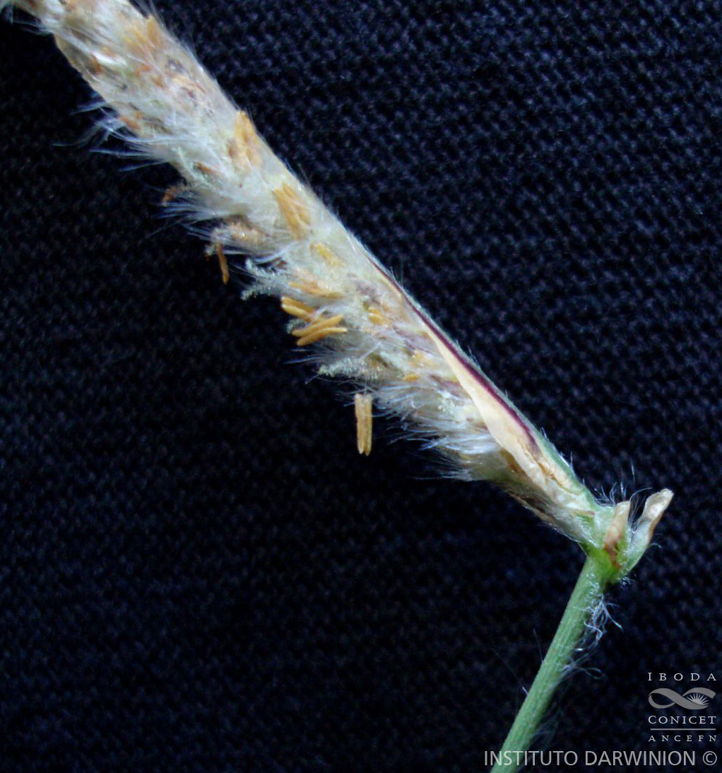 Plantas perennes, cespitosas, cortamente rizomatosas, con catáfilos densamente pilosos; cañas de 25-100 cm x 1-2 mm, simples, erectas a geniculadas, fasciculadas en la base; entrenudos de 3-18 cm de largo, cilíndricos, huecos, glabros; nudos 3-6, castaños, glabros a cortamente pilosos; vainas de 4-8 cm de largo, estriadas, glabras a hirsutas, con pelos tuberculados, caducos, los márgenes membranáceos; vainas basales superpuestas; lígulas membranáceas, breves, de 0,2 mm de largo, castañas, glabras; pseudolígula presente, formada por un mechón de pelos cortos entremezclados con pelos largos hasta de 0,5 mm de largo; cuello glabro; láminas filiformes, de 8-27 cm x 1-3 mm, ascendentes, erectas, rígidas, involutas, predominantemente basales, esparcidamente papiloso-hirsutas, con pelos largos, tuberculados, en ambas caras o sólo en la cara adaxial, de base angostada, continuándose imperceptiblemente con la vaina y ápice largamente agudo, los márgenes basales largamente pestañosos. Inflorescencias terminales exertas; pedúnculos largamente exertos, hasta de 25 cm de largo, cortamente glabros a hirsutos; eje principal no desarrollado; pulvínulos cortamente pilosos, con (1-)2 brácteas papiráceas en su base; racimo 1, raro 2, falcado; raquis de los racimos anchamente foliáceo, de 2-15 cm x (4-)5-10 mm, glabro en ambas caras a cortamente hispídulo hacia la cara adaxial, cara adaxial con nervio medio manifiesto, verde a violáceo, los márgenes membranáceos, hialinos, castaño claro a dorados, planos a plegados, cubriendo a la espiguillas y terminando en una prolongación estéril; pedicelos breves, de 0,1-0,2 mm de largo, cortamente hirsutos, con pelos radiados hacia el ápice; espiguillas solitarias, dispuestas en 2 series. Espiguillas obovoides a elipsoides, de 2,4-3,9 x 1,2-1,6 mm, plano-convexas, de ápice agudo, pajizas o con tintes violáceos hacia el ápice o en toda la superficie, vilosas, con los márgenes largamente pestañosos, los superiores papilosos, con pelos blanquecinos, papiloso-sedosos, hasta de 4 mm de largo, con un mechón de pelos hacia la base, el resto glabro; gluma superior y lemma inferior subiguales, tan largas como la espiguilla, membranáceo-hialinas, los márgenes rígidos; gluma inferior ausente; gluma superior de 2,4-3,9 mm de largo, 2(-3)nervia, con los nervios próximos a los márgenes, el nervio central tenue o ausente; lemma inferior glumiforme, 2-nervia, con los nervios próximos a los márgenes; pálea y flor inferior ausentes; antecio superior angostamente obovoide a elipsoide, de 1,8-2,9 x 0,8-1 mm, 0,4-1 mm más corto que la gluma superior y la lemma inferior, cartáceo, pálido, liso, glabro, cortamente estipitado, abierto en su extremo superior, fácilmente caedizo a la madurez sin las brácteas; lodículas 2, de 0,2 mm de largo; estambres 3, anteras de 1,8-2 mm de largo; cariopsis obovoide, de 1,6 x 0,8 mm; hilo elíptico; embrión ½ o menos del largo de la cariopsis.
