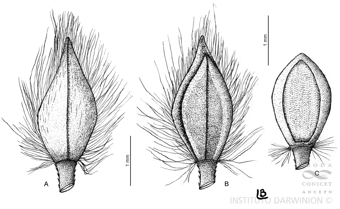 A, espiguilla lado gluma; B, espiguilla lado opuesto; C, antecio y pedicelo.