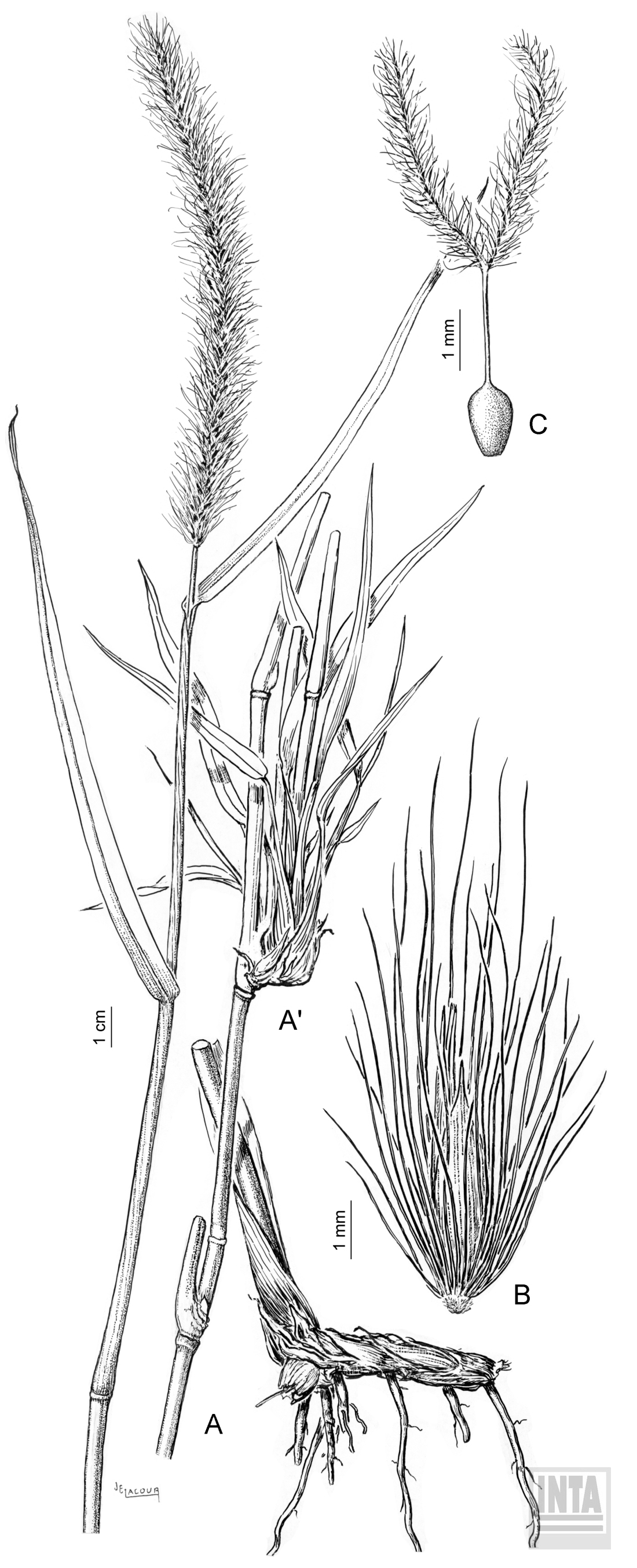 Plantas perennes, cespitosas, provistas de rizomas cortos y gruesos; cañas subleñosas, cilíndricas, de 1-2 m de alto y 3-6 mm de diámetro, macizas o de canal medular reducido, con los entrenudos cilíndricos, glabros, cubiertos por una cerosidad blanquecina, nudos glabros, algo engrosados en la base; vainas abiertas, glabras, con una yema plana en su axila, yema protegida por escamas parduscas, de consistencia papirácea; lígulas pestañosas, formadas por un anillo de pelos cortos de 1-2 mm de largo; láminas lineales, planas cuando frescas, luego caducas, de 10-35 x (0,3-)0,5-1 cm, glabras a escabrosas, de base ancha y ápice acuminado, nervio medio conspicuo. Inflorescencia en panoja espiciforme terminal, solitaria en el eje floral, alargada, densa, exerta, generalmente erguida, castaño-pajiza, de 5-14 x 1-1,8 cm considerando las setas (0,8-1,3 cm de ancho excluyendo las setas); pedúnculos cilíndricos, normalmente rectos, hasta de 9 cm de largo; raquis de la panoja delgado, longitudinalmente estriado, escabroso a brevemente piloso, no dispuesto en zig-zag; involucro no adherente, formado por 16-25 setas lineal-escabrosas, soldadas levemente en la base, con dentículos antrorsos, de largo variado, menores, iguales y mayores que la espiguilla, de 3-12 mm de largo, generalmente con 1-4 setas más larga que las restantes, de 9-13 mm de largo. Espiguillas lanceoladas, solitarias por involucro, de 3,5-6 x 1-1,2 mm, subsésiles, glabras, 2-floras, con el antecio inferior neutro y el superior perfecto, base de la espiguilla pubescente o hirsuta; gluma inferior membranácea, de 1,5-2,5 mm de largo, 1-nervia, de ápice agudo; gluma superior membranácea, de (3-)3,5-5 mm de largo, (5-)7-nervia, de ápice agudo-acuminado; lemma inferior oblonga, de (3,5-)4-5,5 x 1-1,3 mm, 5-7-nervia, de ápice agudo o acuminado; pálea inferior ausente; lemma superior lanceolada, de (3,5-)4-5,5(-6) x 1-1,3 mm, 5-nervia, de ápice agudo o mucronado; pálea superior levemente menor que la lemma; estambres 3, anteras de 2-3,5 mm de largo, de ápice glabro, con los filamentos estaminales rara vez exertos; gineceo con las ramas estigmáticas exertas, de 2-2,5 mm de largo, estilos apenas soldados en la base; cariopsis globosa, ca. 2 mm de largo.