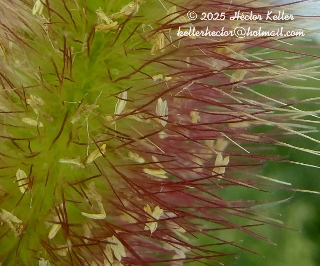 Plantas perennes, cespitosas, robustas; cañas herbáceas, de canal medular reducido, ramificadas y decumbentes en la base de 1,2-2,5(-3) m de alto y 5-9 mm de diámetro, entrenudos cilíndricos, estriados o longitudinalmente acanalados y glabros, nudos engrosados, glabros; vainas ligeramente aquilladas hacia el ápice, glabras o pilosas, sin yema en su axila; lígulas pestañosas, formadas por un anillo de pelos cortos de 1-1,5 mm de largo; láminas planas, angostamente lanceoladas, de 18-30 x (0,6-)0,8-1,3(-1,5) cm, glabras o escabrosas, de base ancha, a veces redondeada y ápice agudo-acuminado, nervio medio sólo conspicuo en el tercio inferior, próximo a la región ligular. Inflorescencia en panoja espiciforme terminal, solitaria en el eje floral, alargada, densa, exerta, pajiza o purpúrea, generalmente flexuosa a la madurez (formando una "S" en la porción media), de 10-25 x 2-3 cm considerando las setas (1-2 cm de ancho excluyendo las setas); pedúnculos cilíndricos, filiformes, hasta de 9 cm de largo, exertos, rectos o algo curvos; raquis de la panoja cilíndrico, a veces estriado, flexuoso, densamente puberulento, no dispuesto en zig-zag; involucro formado por 20-45 setas lineal-escabrosas, con dentículos antrorsos, rígidas, desiguales en largo (menores, iguales y mayores que la espiguilla), de 4-16 mm de largo, sin una seta marcadamente más larga que las restantes. Espiguillas lanceoladas, solitarias por involucro, de 5-7 x 1-1,2 mm, sésiles a cortamente pediceladas, glabras, 2-floras, con el antecio inferior neutro y el superior perfecto, base de la espiguilla hirsuta o con anillo de pelos; gluma inferior membranácea, de 2-3 mm de largo, generalmente 1-nervia, aguda a subaguda; gluma superior membranácea, de 5-7 mm de largo, 7-9-nervia, acuminada o aguda en el ápice; lemma inferior lanceolada, de 5-7 x 1-1,3 mm, 7-9-nervia, de ápice agudo; pálea inferior ausente; lemma superior papirácea, subulada, de 5-6,5 x 1-1,3 mm, 5-nervia, las nervaduras poco visibles de ápice agudo; pálea superior levemente menor que la lemma, de (4,5-)5-6 mm de largo; estambres 3, anteras de 1,5-2 mm de largo, de ápice glabro, con los filamentos estaminales rara vez exertos; gineceo con las ramas estigmáticas poco exertas, de 2-2,5 mm de largo, estilos apenas soldados en la base; cariopsis globosa, de 1,5-2 mm de largo.