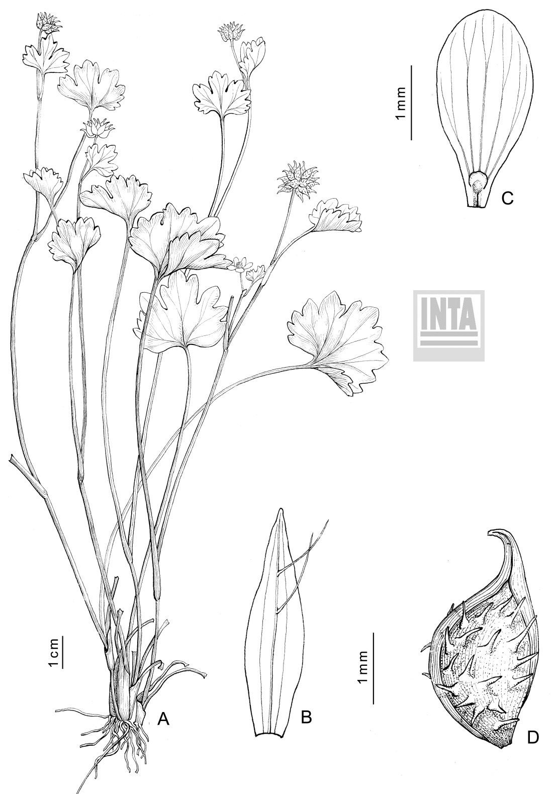 Hierbas de 4-40 cm de alto, erguidas, glabras o muy poco pubescentes; tallos huecos. Hojas algo heteromorfas; pecíolos hasta de 28 cm de largo, acanalados; vaina estipular amplexicaule, con bordes escariosos, a menudo auriculadas; lámina de las hojas inferiores de contorno suborbicular o reniforme, de 1-9 × 0,8-10 cm, 3-lobada a profundamente 3-partida, base cordada o truncada, segmentos laterales lobados o irregularmente dentados; láminas de las hojas superiores más pequeñas, de 2-3,5 × 1,5-2,4 cm, menos divididas y con pecíolos cortos, segmentos enteros o poco divididos, agudos, base cuneada; las del ápice son enteras y cortamente pecioladas, lanceoladas, de 11-20 × 1-8 mm, agudas. Flores en cimas laxifl oras con pedúnculos acrescentes en la fructificación; brácteas linear-lanceoladas, de 11-12 × 2-2,5 mm, agudas; sépalos 5, ovados a ovado-lanceolados, de 5-9 × 2,5 mm, amarillos; escama nectarífera lingüiforme; estambres 15-30; carpelos 15-30, ovoideo-lanceolados, asimétricos, marginados, atenuándose en el estilo, la superficie con garfios; receptáculo cilíndrico-cónico, cubierto de tricomas rígidos y largos. Frutos aquenios 18-25, obovoides, de (4,5-)5-8(-9) mm de largo × 4-5 mm de diámetro, asimétricos, soldados al receptáculo, marginados, la superficie finamente reticulada y con 18-22 ganchos espinescentes de 1,5-2 mm de largo, encorvados, ápice rostrado.