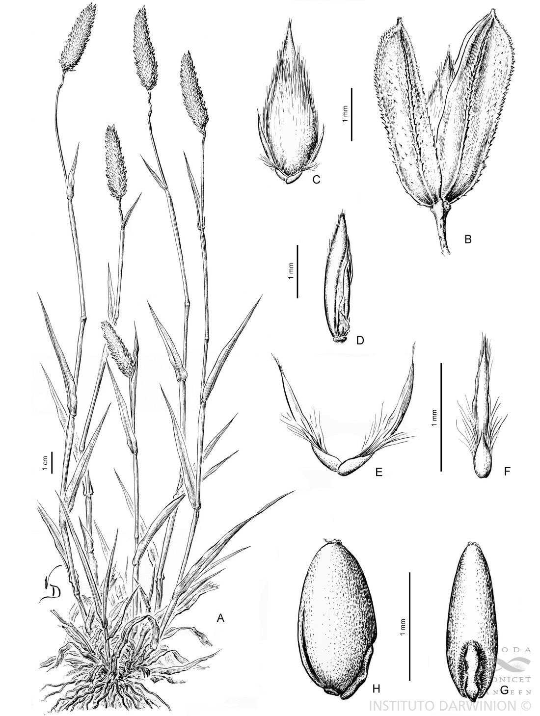 A. Planta. B. Espiguilla, vista lateral. C. Antecio central fértil y laterales estériles. D. Pálea y lodículas. E. Antecios estériles. F. Antecio estéril, vista dorsal. G. Cariopsis, vista escutelar. H. Cariopsis, vista lateral.
