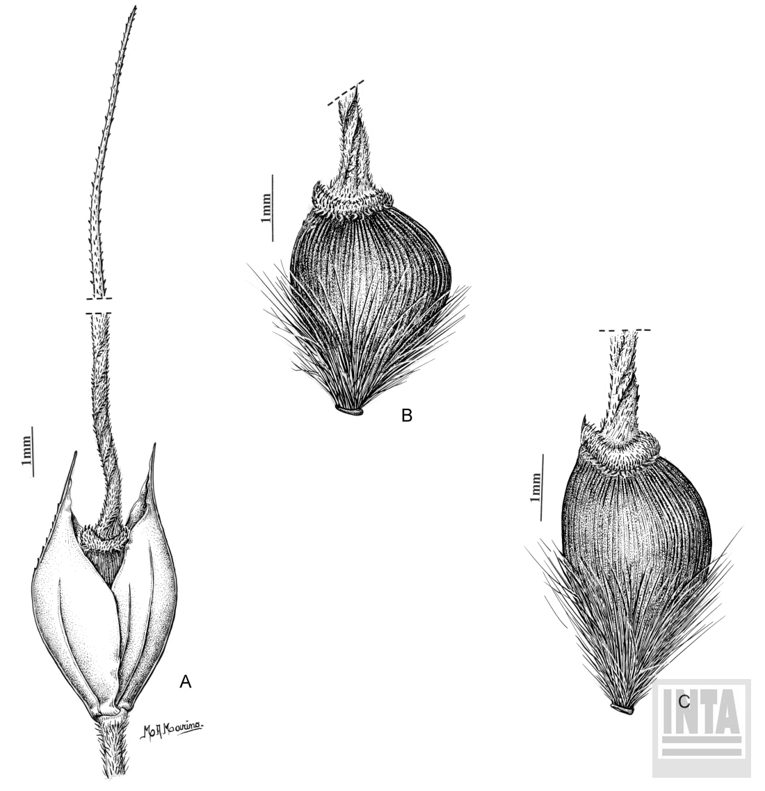 Plantas de 20-60 cm de altura; cañas floríferas de 1-1,2 mm de diámetro, 2-4 nodes; nudos castaños, levemente comprimidos a ligeramente engrosados, glabros; entrenudos de 5-15 cm de largo; vainas ceñidas al tallo, de 4-10 cm de largo, estriadas, glabras, a veces hispídulas hacia el cuello, los márgenes membranáceo-hialinos, glabros, escabriúsculos; lígula obtusa a subaguda, de 0,8-2 mm de largo, glabra, escabriúscula en la cara abaxial, con margen entero, rara vez con algunas cilias; láminas lineares, convolutas o planas, de (5-)14-30 x 0,2-0,4 cm, agudas, ambas caras estriadas, glabras a vilosas, con márgenes escabriúsculos; pedúnculo cilíndrico, levemente aplanado, de 6-10 cm de largo, estriado, glabro. Inflorescencia una panoja de 4-15 x 1,5-3 cm, de 10-70 espiguillas, con ramificaciones laxas a contraídas; cilíndricas, ligeramente aplanadas, estriadas, escabriúsculas; pedicelos aplanados de 2-11 mm de largo, rectos o sinuosos, híspidos. Espiguillas de 4-8,5 x 1,5-2 mm; glumas más largas que el antecio, hialinas, violáceas en su zona media, aristuladas, glabras, 5-nervias; gluma inferior de 5-8,5 mm de largo; gluma superior de 4-7,5 mm de largo; antecio obovoide, globoso o comprimido, de (2,3-)2,5-4(-5) x (0,8-)1,3-2,3 mm, con corona de (0,6-)0,8-1,6(-1,8) mm de ancho, ligeramente revoluta, ceñida a la base de la arista a ensanchada, con hileras de ganchos, aguijones y macropelos cortos densamente dispuestos; lemma ceñida por debajo de la corona, longitudinalmente estriada, brillante, glabra, negro rojiza a la madurez, con ganchos y aguijones inconspicuos a notables, éstos últimos a veces agrupados de a 2 ó 3, con su base cubierta por células epidérmicas adyacentes, uniformemente dispuestos en la zona por debajo de la corona, a muy escasos en el dorso y hacia el margen de la lemma, por debajo de la corona, o bien sin aguijones; antopodio obtuso, de 0,5-0,6 mm de largo, cubierto por pelos castaños densamente dispuestos, los superiores llegando a ? o superando la mitad del largo del antecio; arista bigeniculada, de 1,5-2,5 mm de largo; pálea de 2,5-4(-5) mm de largo; lodículas 2, lineales, agudas, hialinas, glabras; cariopsis esférica a elipsoide, de 1,5-2,5 x 1,5 mm; hilo lineal; embrión ? del largo de la cariopsis.
