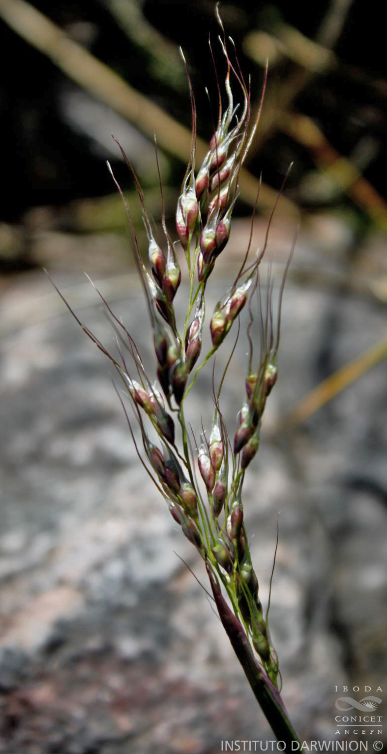 Plantas de 20-60 cm de altura; cañas floríferas de 1-1,2 mm de diámetro, 2-4 nodes; nudos castaños, levemente comprimidos a ligeramente engrosados, glabros; entrenudos de 5-15 cm de largo; vainas ceñidas al tallo, de 4-10 cm de largo, estriadas, glabras, a veces hispídulas hacia el cuello, los márgenes membranáceo-hialinos, glabros, escabriúsculos; lígula obtusa a subaguda, de 0,8-2 mm de largo, glabra, escabriúscula en la cara abaxial, con margen entero, rara vez con algunas cilias; láminas lineares, convolutas o planas, de (5-)14-30 x 0,2-0,4 cm, agudas, ambas caras estriadas, glabras a vilosas, con márgenes escabriúsculos; pedúnculo cilíndrico, levemente aplanado, de 6-10 cm de largo, estriado, glabro. Inflorescencia una panoja de 4-15 x 1,5-3 cm, de 10-70 espiguillas, con ramificaciones laxas a contraídas; cilíndricas, ligeramente aplanadas, estriadas, escabriúsculas; pedicelos aplanados de 2-11 mm de largo, rectos o sinuosos, híspidos. Espiguillas de 4-8,5 x 1,5-2 mm; glumas más largas que el antecio, hialinas, violáceas en su zona media, aristuladas, glabras, 5-nervias; gluma inferior de 5-8,5 mm de largo; gluma superior de 4-7,5 mm de largo; antecio obovoide, globoso o comprimido, de (2,3-)2,5-4(-5) x (0,8-)1,3-2,3 mm, con corona de (0,6-)0,8-1,6(-1,8) mm de ancho, ligeramente revoluta, ceñida a la base de la arista a ensanchada, con hileras de ganchos, aguijones y macropelos cortos densamente dispuestos; lemma ceñida por debajo de la corona, longitudinalmente estriada, brillante, glabra, negro rojiza a la madurez, con ganchos y aguijones inconspicuos a notables, éstos últimos a veces agrupados de a 2 ó 3, con su base cubierta por células epidérmicas adyacentes, uniformemente dispuestos en la zona por debajo de la corona, a muy escasos en el dorso y hacia el margen de la lemma, por debajo de la corona, o bien sin aguijones; antopodio obtuso, de 0,5-0,6 mm de largo, cubierto por pelos castaños densamente dispuestos, los superiores llegando a ? o superando la mitad del largo del antecio; arista bigeniculada, de 1,5-2,5 mm de largo; pálea de 2,5-4(-5) mm de largo; lodículas 2, lineales, agudas, hialinas, glabras; cariopsis esférica a elipsoide, de 1,5-2,5 x 1,5 mm; hilo lineal; embrión ? del largo de la cariopsis.
