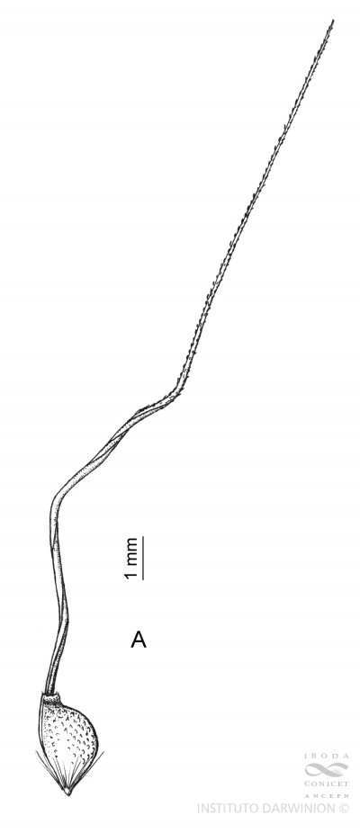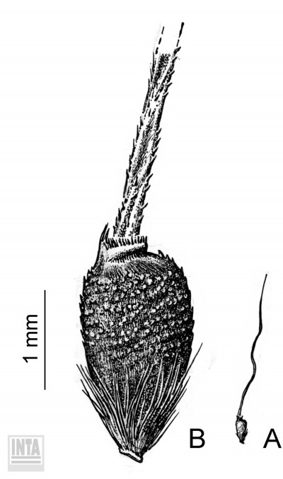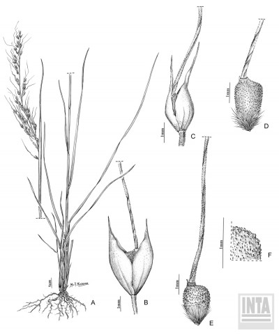 Plantas de 30-80 cm de altura; cañas floríferas de 0,8-1 mm de diámetro, estriadas, 2-3 nodes; nudos castaños a negruzcos, a veces comprimidos, glabros; entrenudos de 10-16 cm de largo; vainas ceñidas al tallo, de 3-8 cm de largo, estriadas, glabras, con margen membranáceo-hialino, glabro a ligeramente escabriúsculo; lígula de 1-1,5 mm de largo, glabra, con margen entero; láminas lineares, convolutas, de (6-)11-22 cm x 1-2 mm, ambas caras estriadas, más conspicuamente la adaxial, glabras o bien epifilo hispídulo en la base, margen liso a ligeramente escabriúsculo hacia el ápice; pedúnculo cilíndrico de 10-22(-28) cm de largo, estriado, glabro. Inflorescencia una panoja de 8-25 x 2-9 cm, de aproximadamente 80 flores, con ramificaciones contraídas a laxas, cilíndricas a comprimidas hacia el ápice, estriadas, escabriúsculas; pedicelos cilíndricos de 1-5,5 mm de largo, escabrosos, rectos o sinuosos. Espiguillas de 3-4 x 1-1,5 mm; glumas más largas que el antecio, acuminadas, 5-nervias, violáceas hacia la porción basal, glabras, hispídulas sobre el nervio medio hacia el ápice; gluma inferior de 3,5-4 mm de largo; gluma superior de 3-3,5 mm de largo; antecio de (1,8-)2,4-3(-3,5) x 0,8-1,2 mm, globoso, rara vez levemente comprimido y alargado, castaño cuando maduro; lemma ceñida por debajo de la corona, fina y longitudinalmente estriada, glabra, con ganchos y aguijones, a veces estos últimos asociados en su base a los bordes de las células adyacentes, uniforme y densamente dispuestos en toda la superficie de los ¾ superiores, a veces disminuyendo su densidad hacia la corona; corona inconspicua, ceñida a la base de la arista, hasta de 0,5(-0,6) mm de diámetro, con ganchos y aguijones en su borde; antopodio de 0,2-0,5 mm de largo, obtuso, truncado, cubierto por pelos blanquecinos a dorados densamente dispuestos, los superiores llegando hasta ½ del largo del antecio; arista bigeniculada, de 1,1-2,5 cm de largo; pálea de ca. 2 mm de largo, con escasas papilas inflexas en el surco; lodículas 3, elípticas, de 0,5 mm de largo, glabras; cariopsis de 0,8-1,5 x 0,8-1 mm, subglobosa, comprimida lateralmente; hilo linear; embrión ¼-? del largo de la cariopsis.