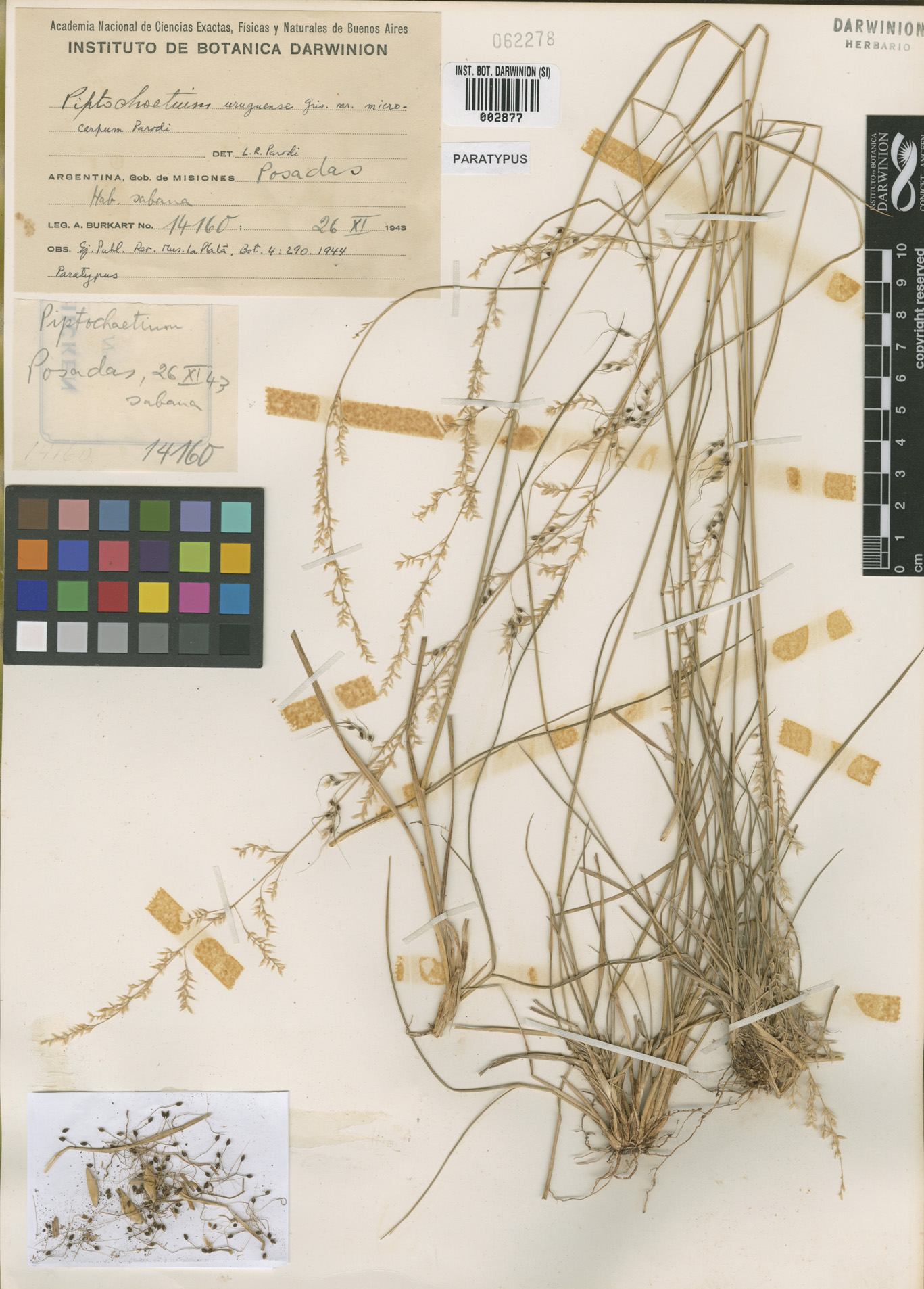 Piptochaetium uruguense Griseb. var. microcarpum Parodi var. microcarpum Parodi Revista Mus. La Plata, Secc. Bot. 6(25): 290, f. 35C. 1944 TIPO. Argentina. Corrientes. Dpto. San Martín: Yapeyú, 11 Nov 1936, L. R. Parodi 12637 (holotipo, BAA!).