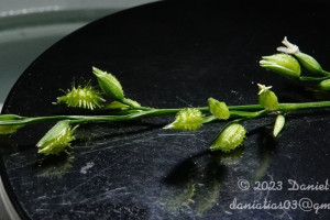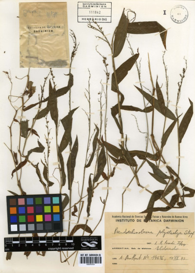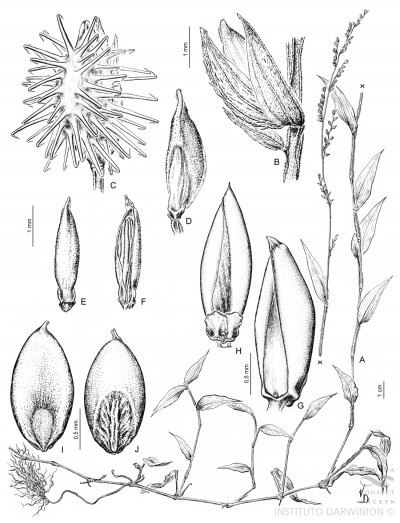 Plantas perennes, rastreras, con cañas decumbentes, arraigadas y ramificadas en los nudos inferiores; porción erecta de 10-40 cm de alto; entrenudos cilíndricos, glabros; vainas usualmente menores que los entrenudos, glabras a esparcidamente pilosas, los márgenes pestañosos; lígulas membranáceas, de 0,5-0,8 mm de largo, castañas; láminas ovado-lanceoladas, de 2-7,5 x 0,6-1,6 cm, planas, glabras a esparcidamente pilosas, de base redondeada, usualmente asimétrica, ápice agudo, los márgenes escabrosos. Inflorescencias de (3-)10-30 x 1-2 cm, con 3-9 racimos unilaterales, alternos, ascendentes, poco divergentes del eje principal; raquis de los racimos de 1-4 cm x 0,5 mm, triquetro; espiguillas en pares o solitarias, sobre pedicelos triquetros, hasta de 2,5 mm de largo. Espiguillas ovoides, de 3,2-4,2 x 1,6 mm, equinuladas, verde oscuro; gluma inferior anchamente lanceolada, aproximadamente tan larga como la espiguilla, acuminada, 3-5-nervia; gluma superior ovada, tan larga como la espiguilla, aguda, 5-7-nervia; lemma inferior endurecida, 5-7-nervia; pálea inferior cartácea, 2-nervia; antecio superior elipsoide, ½-?del largo de la espiguilla, agudo, endurecido, pajizo, lustroso; cariopsis elipsoide, de 1,8 x 0,8 mm; hilo punctiforme; embrión ? del largo de la cariopsis.