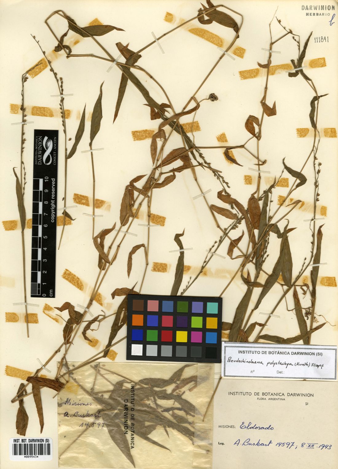 Plantas perennes, rastreras, con cañas decumbentes, arraigadas y ramificadas en los nudos inferiores; porción erecta de 10-40 cm de alto; entrenudos cilíndricos, glabros; vainas usualmente menores que los entrenudos, glabras a esparcidamente pilosas, los márgenes pestañosos; lígulas membranáceas, de 0,5-0,8 mm de largo, castañas; láminas ovado-lanceoladas, de 2-7,5 x 0,6-1,6 cm, planas, glabras a esparcidamente pilosas, de base redondeada, usualmente asimétrica, ápice agudo, los márgenes escabrosos. Inflorescencias de (3-)10-30 x 1-2 cm, con 3-9 racimos unilaterales, alternos, ascendentes, poco divergentes del eje principal; raquis de los racimos de 1-4 cm x 0,5 mm, triquetro; espiguillas en pares o solitarias, sobre pedicelos triquetros, hasta de 2,5 mm de largo. Espiguillas ovoides, de 3,2-4,2 x 1,6 mm, equinuladas, verde oscuro; gluma inferior anchamente lanceolada, aproximadamente tan larga como la espiguilla, acuminada, 3-5-nervia; gluma superior ovada, tan larga como la espiguilla, aguda, 5-7-nervia; lemma inferior endurecida, 5-7-nervia; pálea inferior cartácea, 2-nervia; antecio superior elipsoide, ½-?del largo de la espiguilla, agudo, endurecido, pajizo, lustroso; cariopsis elipsoide, de 1,8 x 0,8 mm; hilo punctiforme; embrión ? del largo de la cariopsis.
