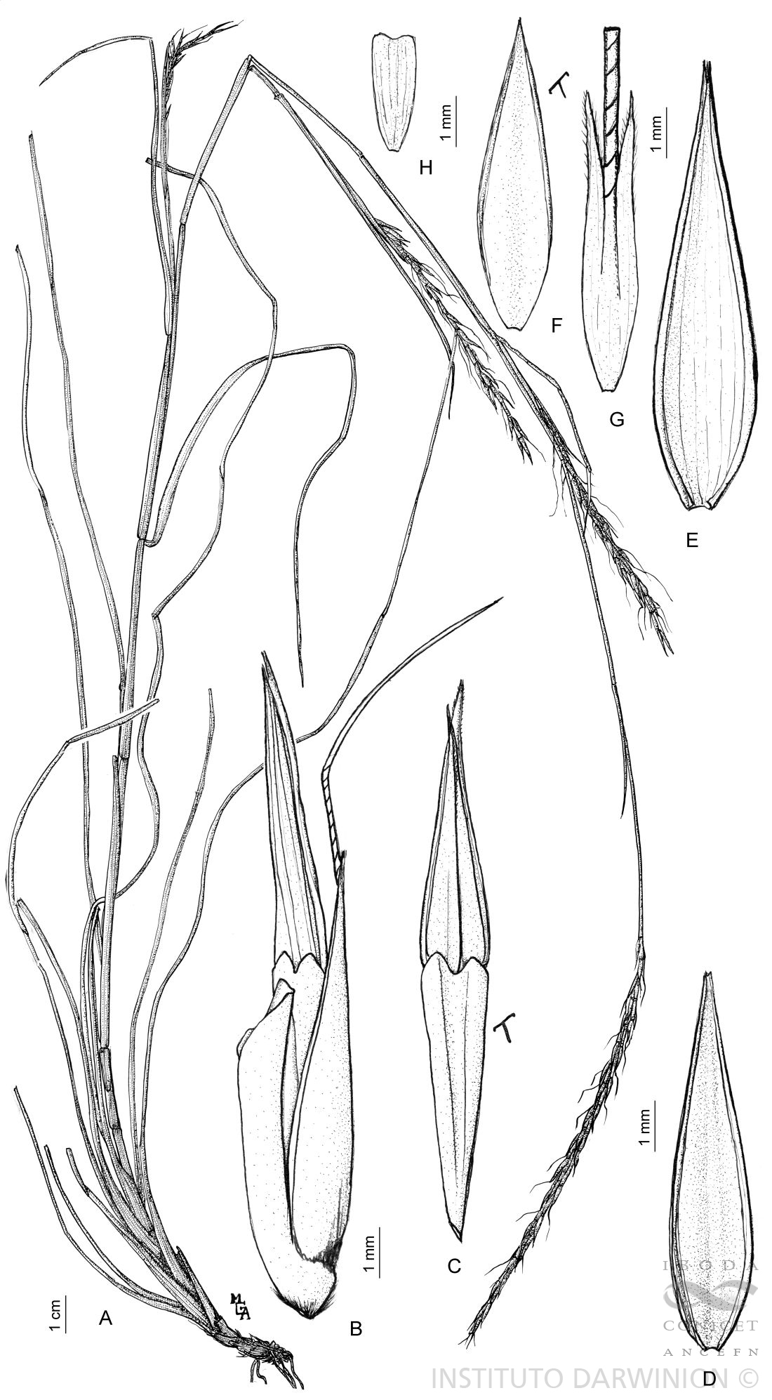 Plantas perennes de 20-80 cm de alto, rizomas breves, superficiales, cubiertos por los restos de vainas viejas; cañas generalmente con inflorescencias terminales; lígulas de 1-1,5 mm de largo, membranáceo-papiráceas; láminas de 5-12 cm x 2-5 mm, lineares, planas o carinadas hacia la base, porción basal a veces con pelos largos y blancos. Inflorescencia escasamente ramificada, con 1-4 racimos espiciformes; espateola de 5-10(-12) cm de largo, con lámina reducida de 1-4 cm x 0,5-1 mm; pedúnculo de 7-30 cm de largo, cuando joven incluso en la espateola, porción apical ligeramente dilatada de 1-1,5 mm de ancho, oblicua e irregularmente dentada, exerta a la madurez en ¼-? de su longitud; racimos de 5-15 cm de largo con 6-15 pares de espiguillas, amarillentos o amarillo-verdosos y exertos a la madurez; raquis recto; artejos de 3,5-6 mm de largo, rectos, glabros y dilatados en toda su longitud, ápice ca. 1,5 mm de ancho, ligeramente oblicuo, 2-dentado; callo oblicuo, con pelos de 0,5-1 mm de largo, poco visibles en las articulaciones del racimo. Espiguillas adpresas al raquis. Espiguillas sésiles de 6,5-10,5 mm de largo; gluma inferior de 6-10 mm de largo, cartácea, plana a ligeramente convexa, 6-9-nervia (visibles en la zona ventral), ápice agudo o levemente bífido, carinas escabriúsculas en la porción superior, en vista dorsal zona más deprimida y algo oscura en la base; gluma superior de 6-8 mm de largo, más tenue que la inferior, dorso con asperezas, bordes inflexos hialinos; lemma estéril de 4-6 mm de largo, ápice obtuso o agudo, cara ventral generalmente con una fina pubescencia cerca del ápice; lemma fértil de 4-5,5 mm de largo lobada en el tercio superior, lóbulos de 2-2,5 mm de largo con una cierta pubescencia en la cara interna de los lóbulos; arista de 10-15 mm de largo entre los lóbulos; pálea generalmente presente, hialina, de 2-3 mm de largo, generalmente, glabra, ápice obtuso o subagudo, piloso; anteras de 2-2,3 mm de largo; ovario de 0,5-1 mm de largo, estigmas plumosos de 1-2 mm de largo, lodículas de 0,5 mm de largo, hialinas; cariopsis de 3-4 x 1 mm, ligeramente deprimida en la zona del embrión. Espiguillas pediceladas neutras o estaminadas, de 9-12 mm de largo, múticas; pedicelos de 5-6 mm de largo, ligeramente comprimidos, glabros, a veces el lado ventral con una fina pubescencia; glumas y glumelas de similares características a la espiguilla sésil; gluma superior de 5-6,5 mm de largo; gluma inferior de 4-5,5 mm de largo, lemmas hialinas de menor longitud que las glumas, pálea presente de 1-1,5 mm de largo; estambres 3 cuando presentes, con anteras de 2-2,3 mm de largo.