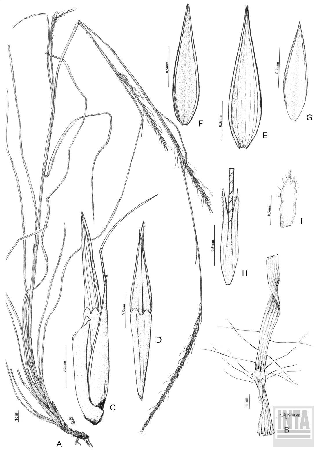 Plantas perennes de 20-80 cm de alto, rizomas breves, superficiales, cubiertos por los restos de vainas viejas; cañas generalmente con inflorescencias terminales; lígulas de 1-1,5 mm de largo, membranáceo-papiráceas; láminas de 5-12 cm x 2-5 mm, lineares, planas o carinadas hacia la base, porción basal a veces con pelos largos y blancos. Inflorescencia escasamente ramificada, con 1-4 racimos espiciformes; espateola de 5-10(-12) cm de largo, con lámina reducida de 1-4 cm x 0,5-1 mm; pedúnculo de 7-30 cm de largo, cuando joven incluso en la espateola, porción apical ligeramente dilatada de 1-1,5 mm de ancho, oblicua e irregularmente dentada, exerta a la madurez en ¼-? de su longitud; racimos de 5-15 cm de largo con 6-15 pares de espiguillas, amarillentos o amarillo-verdosos y exertos a la madurez; raquis recto; artejos de 3,5-6 mm de largo, rectos, glabros y dilatados en toda su longitud, ápice ca. 1,5 mm de ancho, ligeramente oblicuo, 2-dentado; callo oblicuo, con pelos de 0,5-1 mm de largo, poco visibles en las articulaciones del racimo. Espiguillas adpresas al raquis. Espiguillas sésiles de 6,5-10,5 mm de largo; gluma inferior de 6-10 mm de largo, cartácea, plana a ligeramente convexa, 6-9-nervia (visibles en la zona ventral), ápice agudo o levemente bífido, carinas escabriúsculas en la porción superior, en vista dorsal zona más deprimida y algo oscura en la base; gluma superior de 6-8 mm de largo, más tenue que la inferior, dorso con asperezas, bordes inflexos hialinos; lemma estéril de 4-6 mm de largo, ápice obtuso o agudo, cara ventral generalmente con una fina pubescencia cerca del ápice; lemma fértil de 4-5,5 mm de largo lobada en el tercio superior, lóbulos de 2-2,5 mm de largo con una cierta pubescencia en la cara interna de los lóbulos; arista de 10-15 mm de largo entre los lóbulos; pálea generalmente presente, hialina, de 2-3 mm de largo, generalmente, glabra, ápice obtuso o subagudo, piloso; anteras de 2-2,3 mm de largo; ovario de 0,5-1 mm de largo, estigmas plumosos de 1-2 mm de largo, lodículas de 0,5 mm de largo, hialinas; cariopsis de 3-4 x 1 mm, ligeramente deprimida en la zona del embrión. Espiguillas pediceladas neutras o estaminadas, de 9-12 mm de largo, múticas; pedicelos de 5-6 mm de largo, ligeramente comprimidos, glabros, a veces el lado ventral con una fina pubescencia; glumas y glumelas de similares características a la espiguilla sésil; gluma superior de 5-6,5 mm de largo; gluma inferior de 4-5,5 mm de largo, lemmas hialinas de menor longitud que las glumas, pálea presente de 1-1,5 mm de largo; estambres 3 cuando presentes, con anteras de 2-2,3 mm de largo.