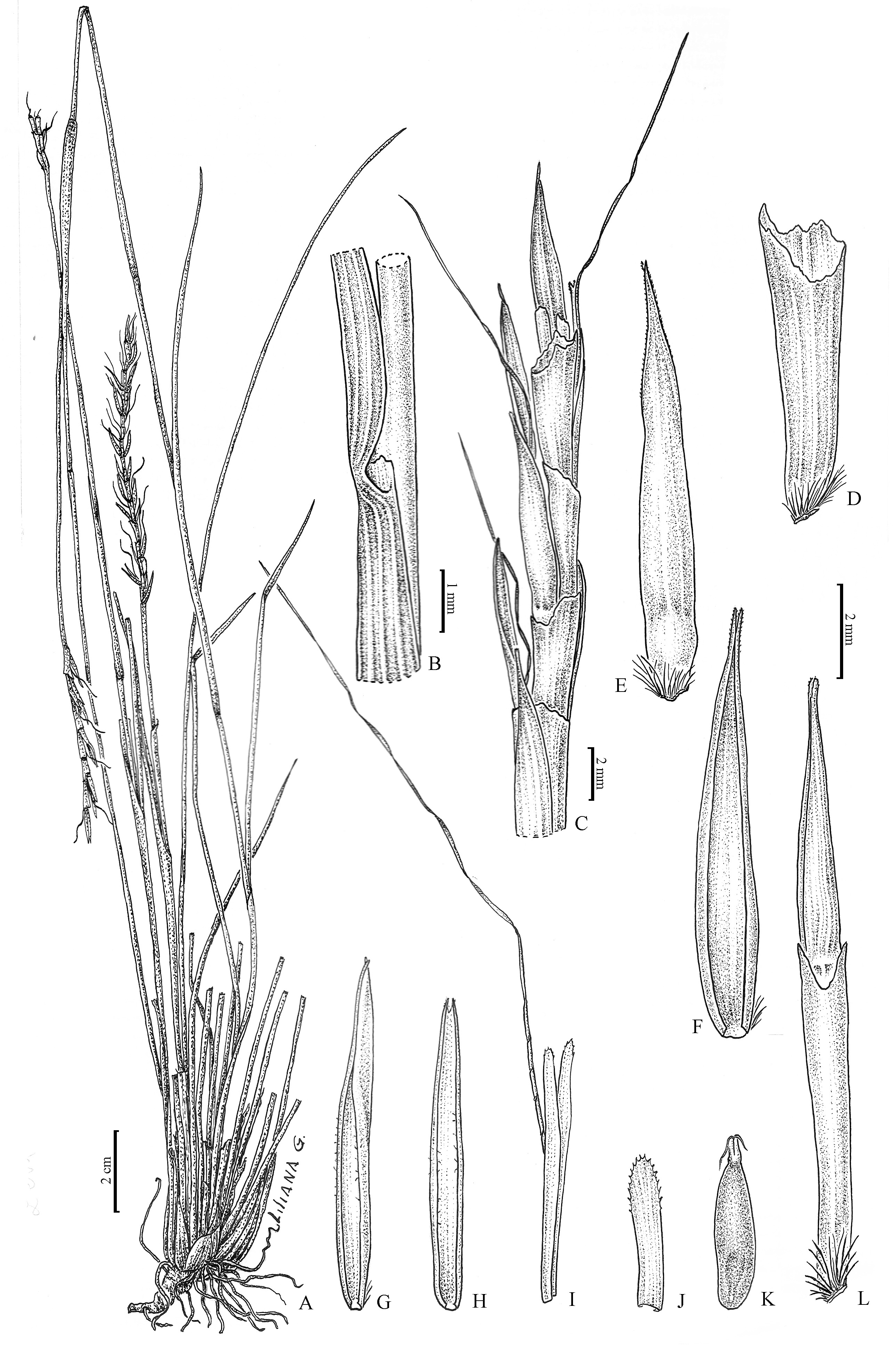 Plantas perennes de 20-80 cm de alto, rizomas breves, superficiales, cubiertos por los restos de vainas viejas; cañas generalmente con inflorescencias terminales; lígulas de 1-1,5 mm de largo, membranáceo-papiráceas; láminas de 5-12 cm x 2-5 mm, lineares, planas o carinadas hacia la base, porción basal a veces con pelos largos y blancos. Inflorescencia escasamente ramificada, con 1-4 racimos espiciformes; espateola de 5-10(-12) cm de largo, con lámina reducida de 1-4 cm x 0,5-1 mm; pedúnculo de 7-30 cm de largo, cuando joven incluso en la espateola, porción apical ligeramente dilatada de 1-1,5 mm de ancho, oblicua e irregularmente dentada, exerta a la madurez en ¼-? de su longitud; racimos de 5-15 cm de largo con 6-15 pares de espiguillas, amarillentos o amarillo-verdosos y exertos a la madurez; raquis recto; artejos de 3,5-6 mm de largo, rectos, glabros y dilatados en toda su longitud, ápice ca. 1,5 mm de ancho, ligeramente oblicuo, 2-dentado; callo oblicuo, con pelos de 0,5-1 mm de largo, poco visibles en las articulaciones del racimo. Espiguillas adpresas al raquis. Espiguillas sésiles de 6,5-10,5 mm de largo; gluma inferior de 6-10 mm de largo, cartácea, plana a ligeramente convexa, 6-9-nervia (visibles en la zona ventral), ápice agudo o levemente bífido, carinas escabriúsculas en la porción superior, en vista dorsal zona más deprimida y algo oscura en la base; gluma superior de 6-8 mm de largo, más tenue que la inferior, dorso con asperezas, bordes inflexos hialinos; lemma estéril de 4-6 mm de largo, ápice obtuso o agudo, cara ventral generalmente con una fina pubescencia cerca del ápice; lemma fértil de 4-5,5 mm de largo lobada en el tercio superior, lóbulos de 2-2,5 mm de largo con una cierta pubescencia en la cara interna de los lóbulos; arista de 10-15 mm de largo entre los lóbulos; pálea generalmente presente, hialina, de 2-3 mm de largo, generalmente, glabra, ápice obtuso o subagudo, piloso; anteras de 2-2,3 mm de largo; ovario de 0,5-1 mm de largo, estigmas plumosos de 1-2 mm de largo, lodículas de 0,5 mm de largo, hialinas; cariopsis de 3-4 x 1 mm, ligeramente deprimida en la zona del embrión. Espiguillas pediceladas neutras o estaminadas, de 9-12 mm de largo, múticas; pedicelos de 5-6 mm de largo, ligeramente comprimidos, glabros, a veces el lado ventral con una fina pubescencia; glumas y glumelas de similares características a la espiguilla sésil; gluma superior de 5-6,5 mm de largo; gluma inferior de 4-5,5 mm de largo, lemmas hialinas de menor longitud que las glumas, pálea presente de 1-1,5 mm de largo; estambres 3 cuando presentes, con anteras de 2-2,3 mm de largo.