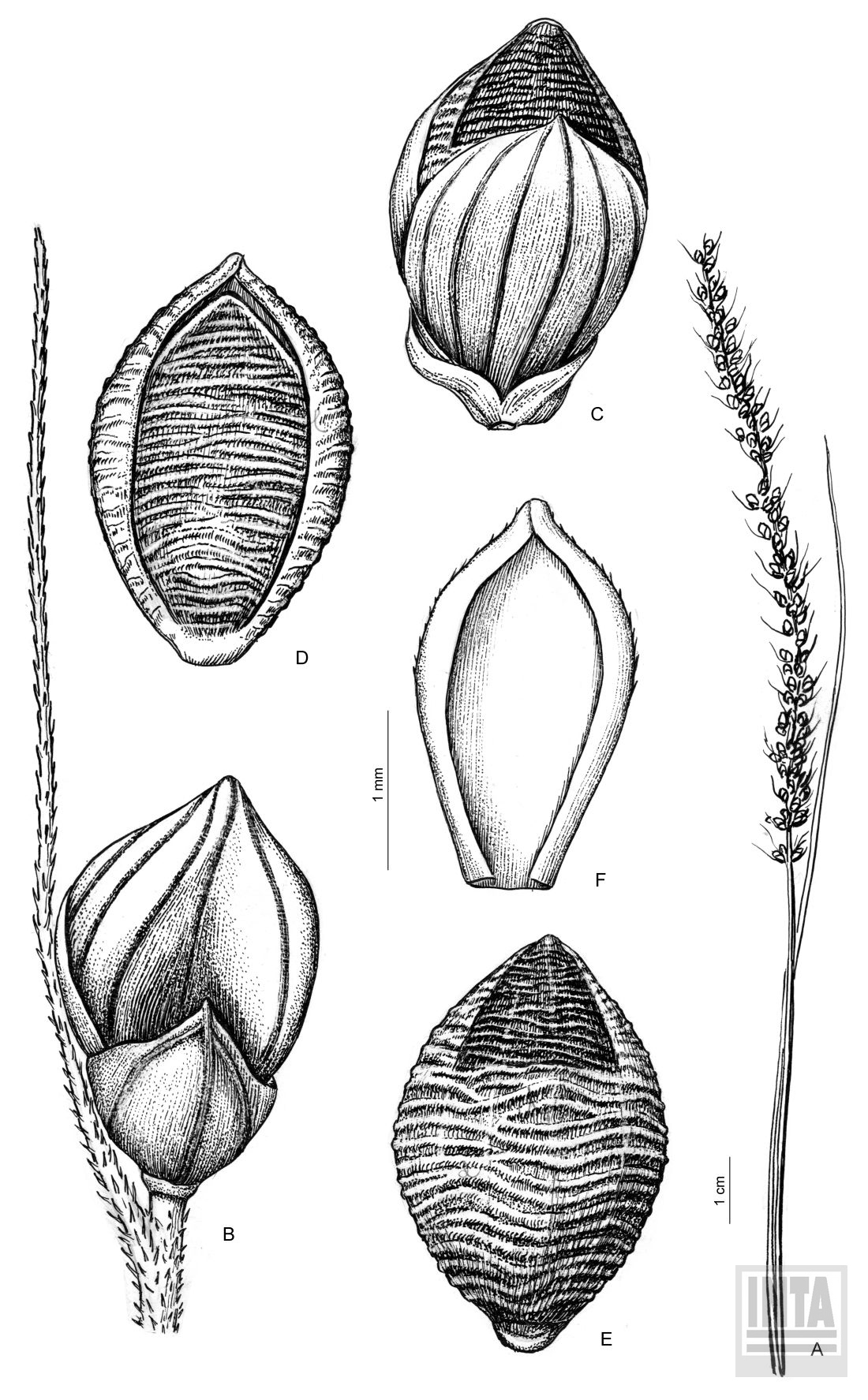 A. Inflorescencia. B. Espiguilla vista ventral con seta. C. Espiguilla vista dorsal. D. Antecio superior vista ventral. E. Antecio superior vista dorsal. F. Pálea superior.