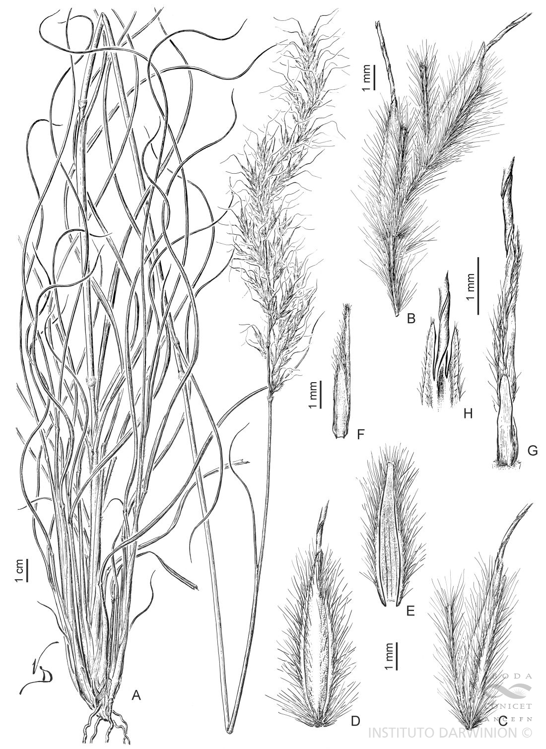A. Planta. B. Parte superior de un racimo. C. Espiguilla sésil vista lateral con artejo de la raquilla. D. Espiguilla sésil vista dorsal. E. Gluma inferior vista ventral. F. Lemma inferior estéril vista ventral. G. Pálea vista dorsal y lemma fértil. H. Ápice de la lemma fértil con porción de la arista.