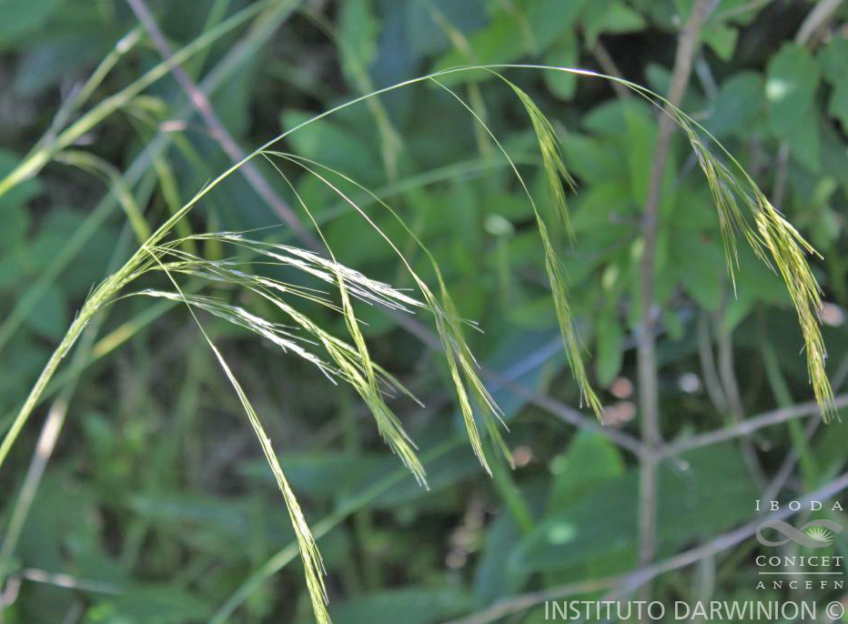 Plantas perennes, cespitosas, medianamente robustas, de 70-100 cm de alto; cañas cilíndricas, ca.1 mm de diámetro, erguidas, rectas, simples, paucinodes; nudos conspicuos, comprimidos, castaños a rojizos, glabros o pubérulos; entrenudos longitudinalmente estriados, glabros a pubérulos; vainas foliares estriadas, mayores que los entrenudos, pubescentes, más conspicuamente hacia los bordes en la región del cuello, con margenes hialinos, glabros o ciliados; lígulas truncadas, 0,2- 0,3 mm de largo, membranáceas, con margen laciniado, glabras; láminas foliares lineares, convolutas o planas, de 25-35 cm x 2-4 mm, ambas caras estriadas, pubérulas, con margenes escabriúsculos. Inflorescencia nutante, pauciflora o pluriflora, extendida, de 25-40 cm de largo; raquis cilíndrico, ligeramente estriado, escabroso, ramas y pedicelos angulosos, hispídulos. Espiguillas fusiformes, de 6-7 mm de largo; glumas subiguales, de 4-6 mm de largo, mayores que el antecio, cortamente atenuadas, membranáceas, glabras, 3-nervias, hispídulas sobre los nervios; lemma cilíndrica, ligeramente fusiforme, de 2-3,5 x 0,5-0,7 mm de diámetro, papilosa y con densos pelos adpresos en toda la superficie, los superiores no pasan la corona; corona conspicua, continua con el cuerpo de la lemma, blanquecina, glabra, con escasos pelitos cortos (0,1 mm de largo) hacia el borde; arista 2-geniculada, de 1,5-3,5 cm de largo, hispídula en toda su extensión, grácil, caediza; antopodio obtuso, oblicuamente truncado, de 0,6-0,7 mm de largo, densamente viloso; pálea obtusa, de 0,3-0,6 mm de largo, glabra; lodículas 2, anchamente oblongas, ca. 1 mm de largo; cariopsis cilíndrica, de 1,7-2 mm de largo; hilo linear 2/3 del largo de la cariopsis.